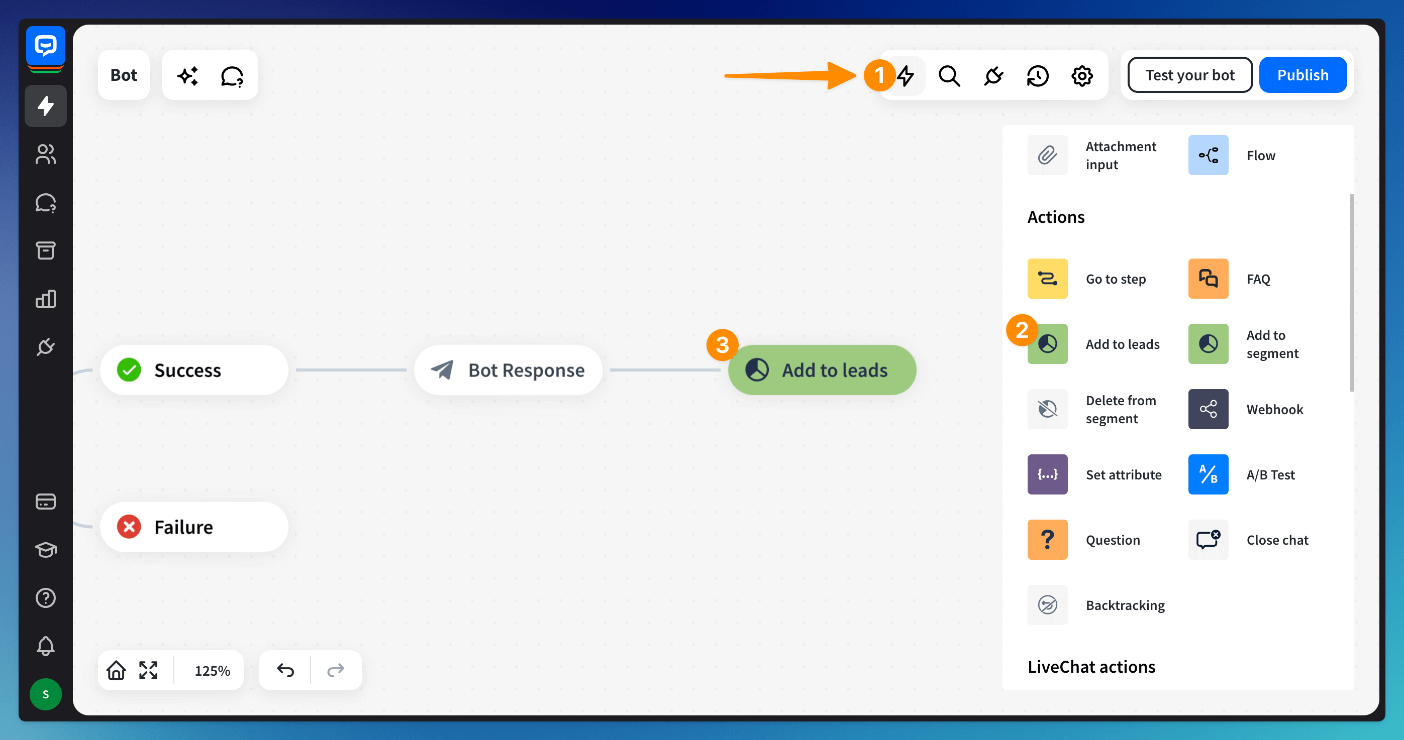 To use this action in the bot flow, drag it from the Actions menu and place it in the bot flow. When this block is triggered in the bot flow, the visitor will be added to the All leads section.