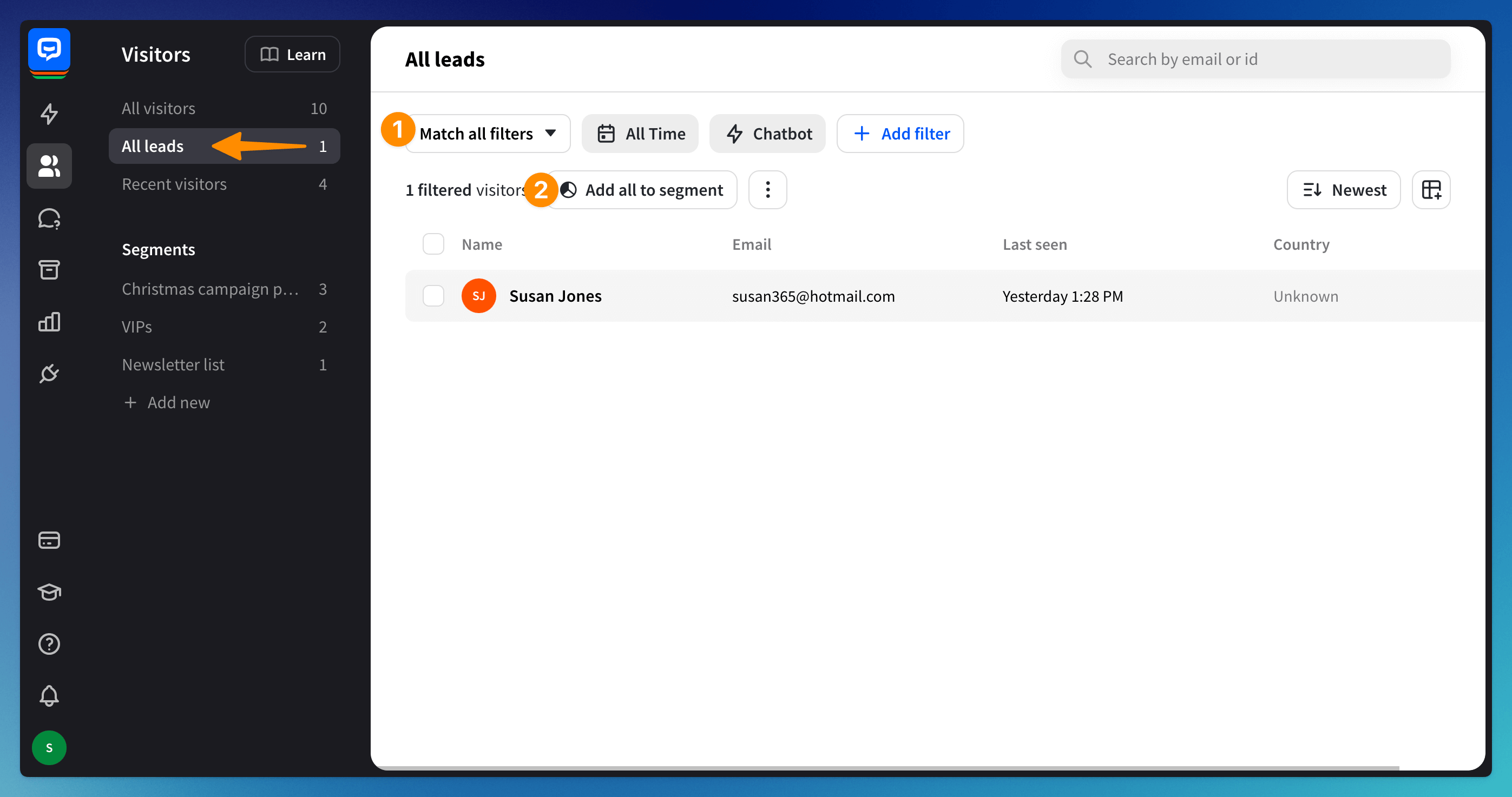 Based on your needs, you can filter (1) the list based on time, the bot name, and the attributes collected during the chat. You can also add these visitors to dedicated segments (2). You can add them beforehand, in the bot flow with the Add to segment action, or in this section.