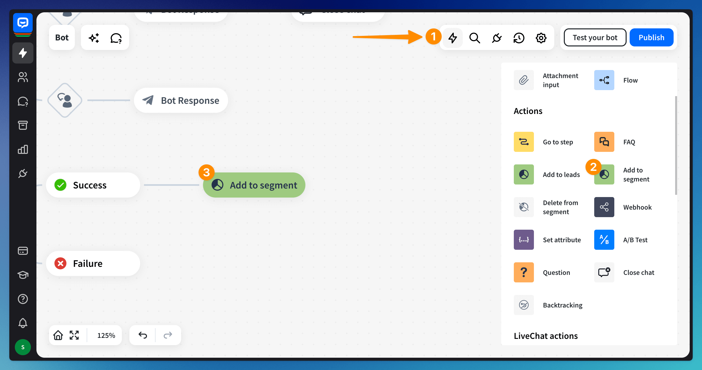 It doesn’t matter whether you add the Add to segment block at the beginning of the path, in the middle of it, or at the end. When the chat is finished, the visitor who completes a particular path will be added to a chosen segment.
