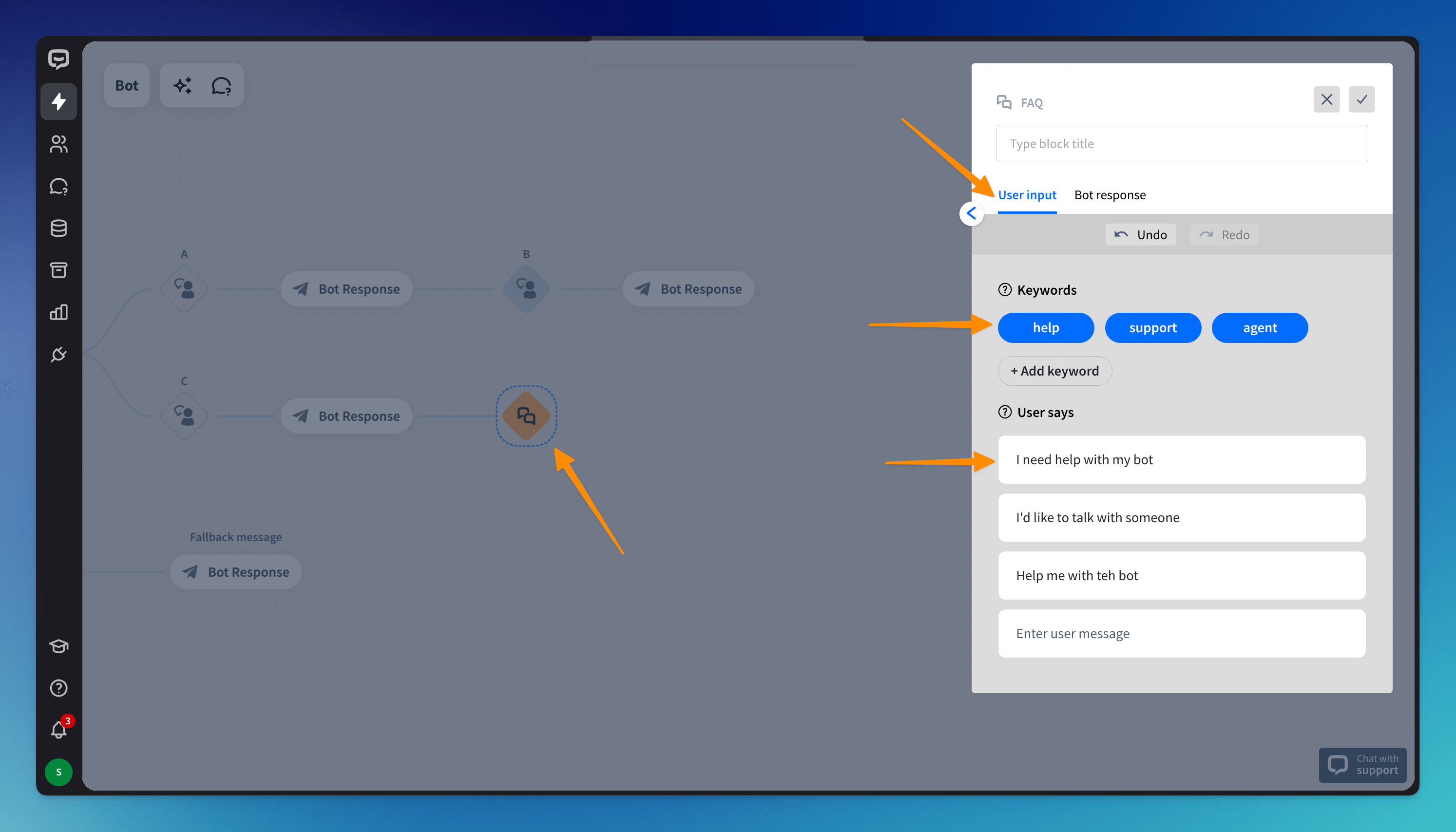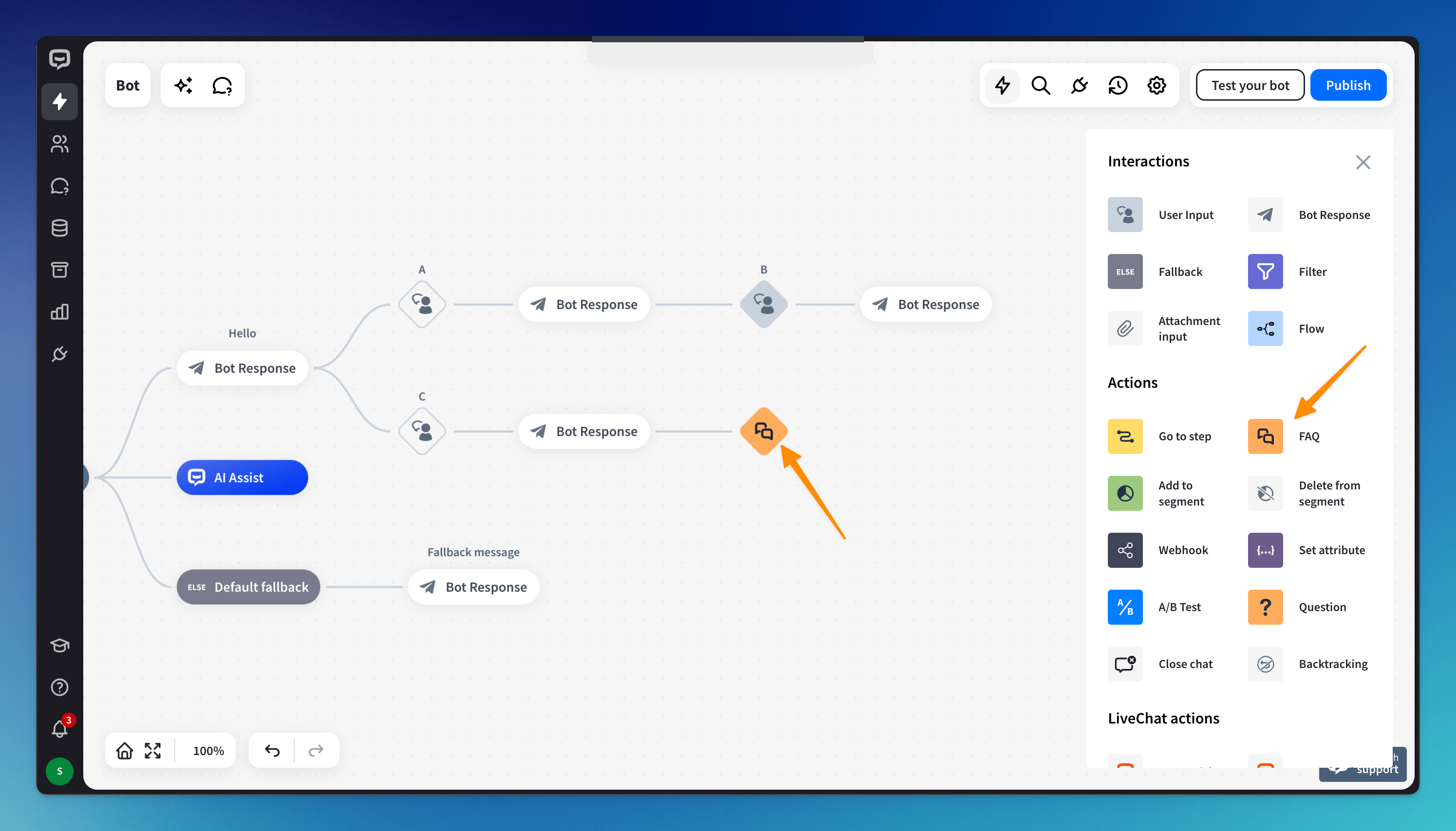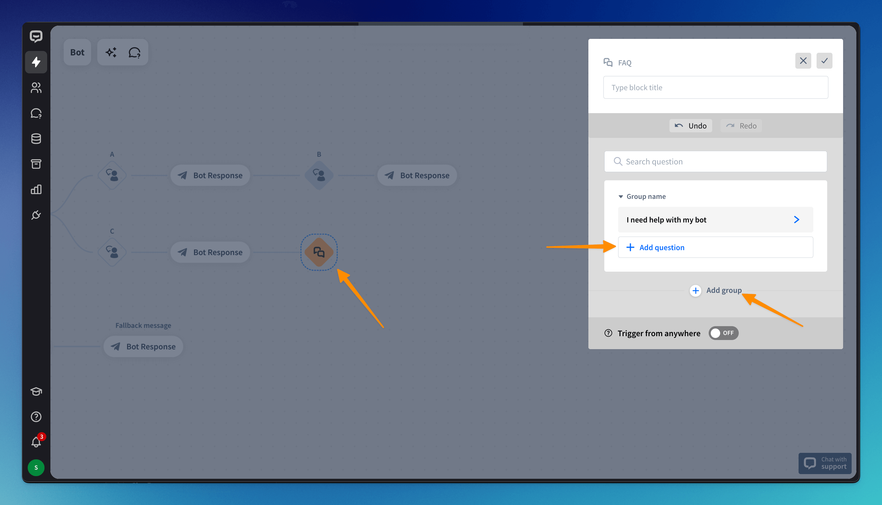 The Context FAQ allows you to create a list of up to 100 questions and add answers to them within a single block, making your bot easier to manage.