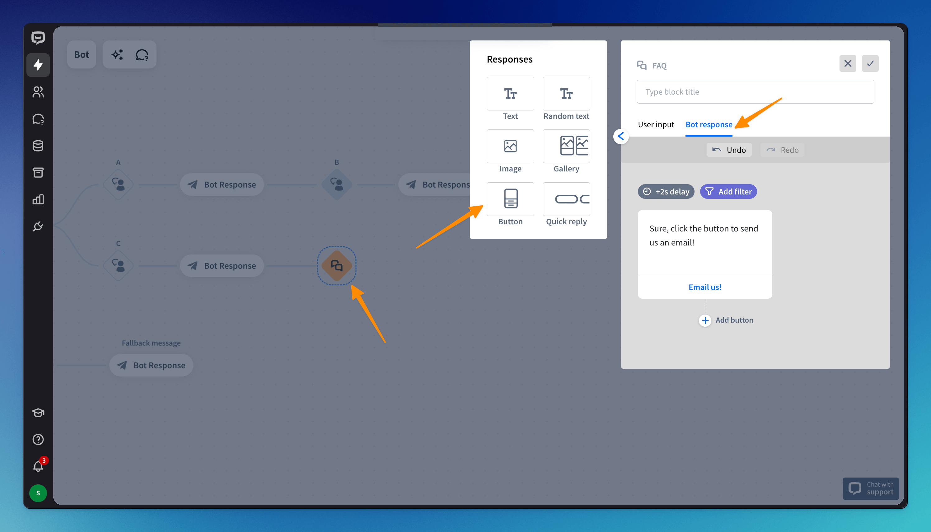 Creating an FAQ block in your chatbot can improve your support efficiency and allow your customers to get responses immediately instead of scrolling through huge lists of frequently asked questions. Spend less time responding to repeated messages to focus on more complex issues.