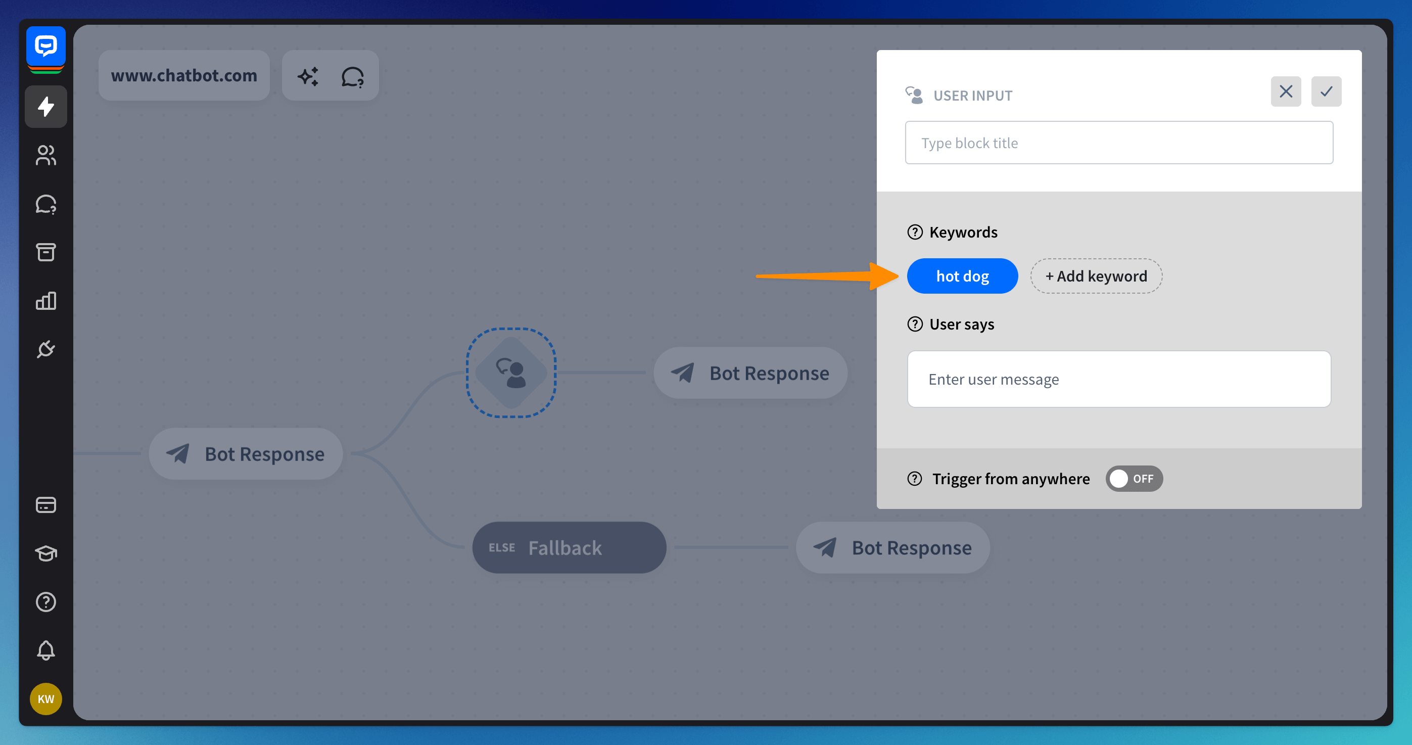 The best way to explain the behavior of keywords is to use an example. Imagine that you own a small food truck business, and your bot takes food orders. One of your most famous menu options is a hot dog.
