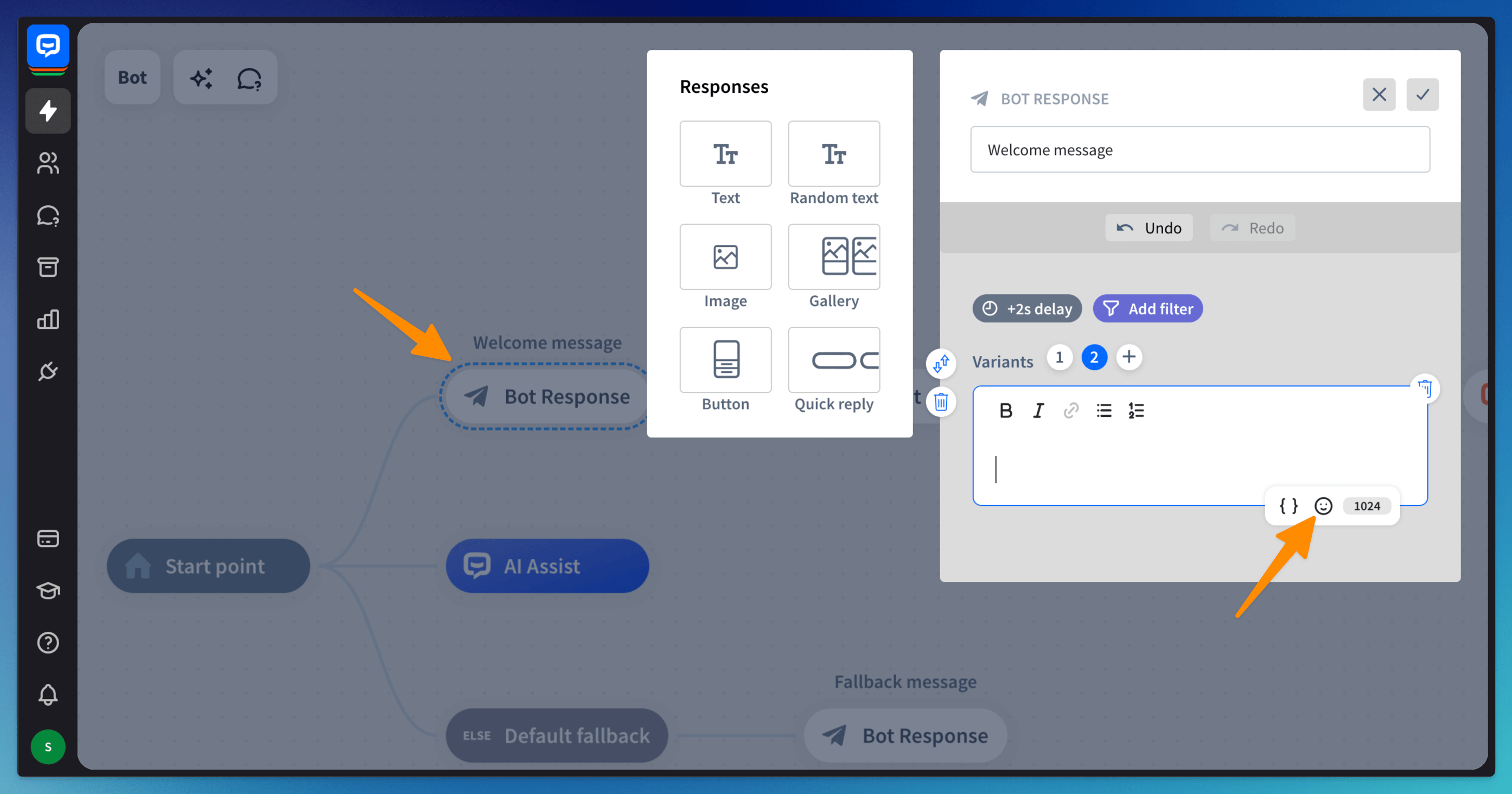 Click on the Bot Response block in your bot flow. Add a new response and click on the emoji picker. Browse through available emojis. Select your favorite one and add it to your response.