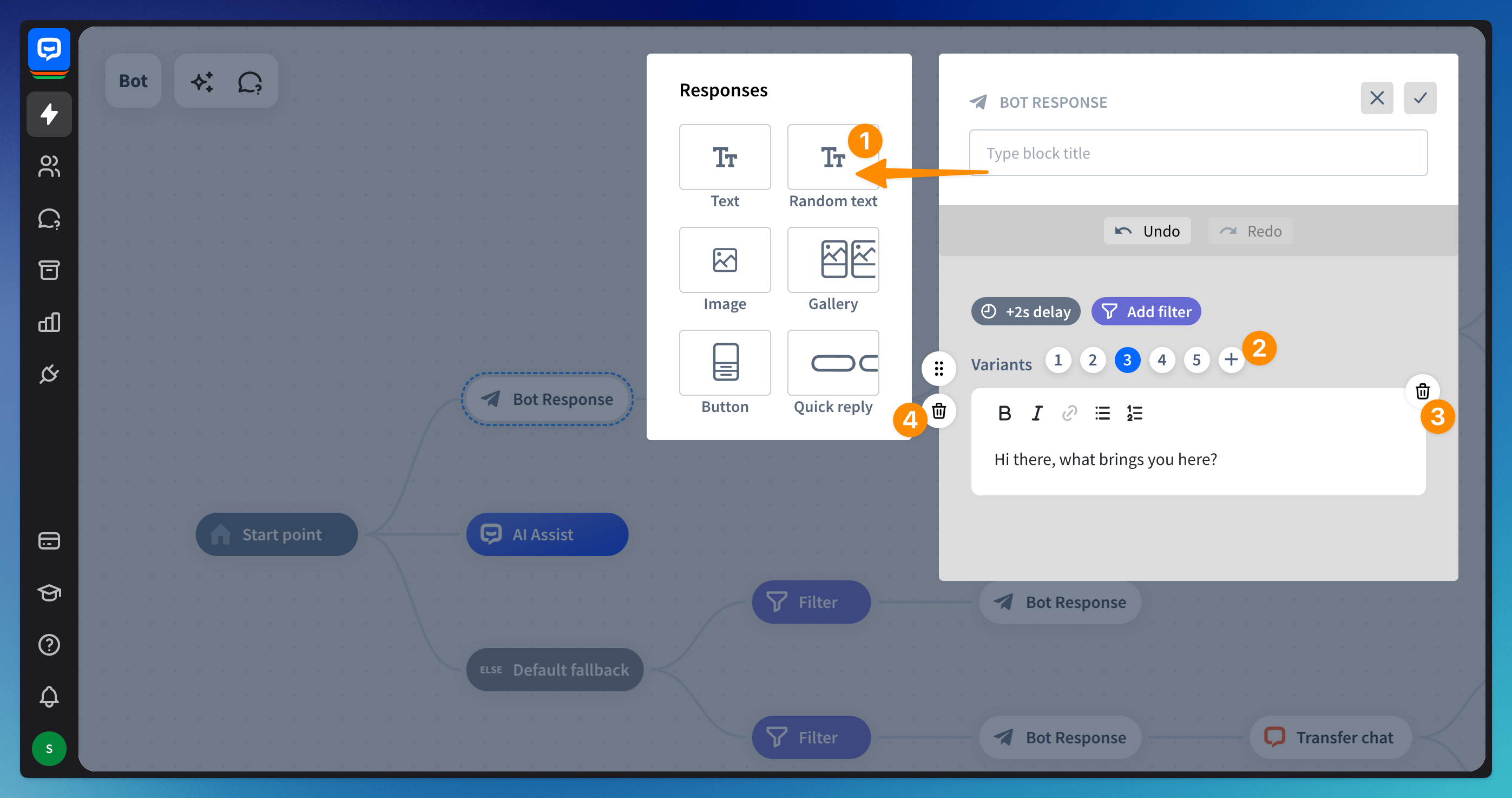 Go to the Bot response block and select the Random text response type (1). Add more message options with the + sign (2) above the text field. You can revise the messages by clicking on each number.