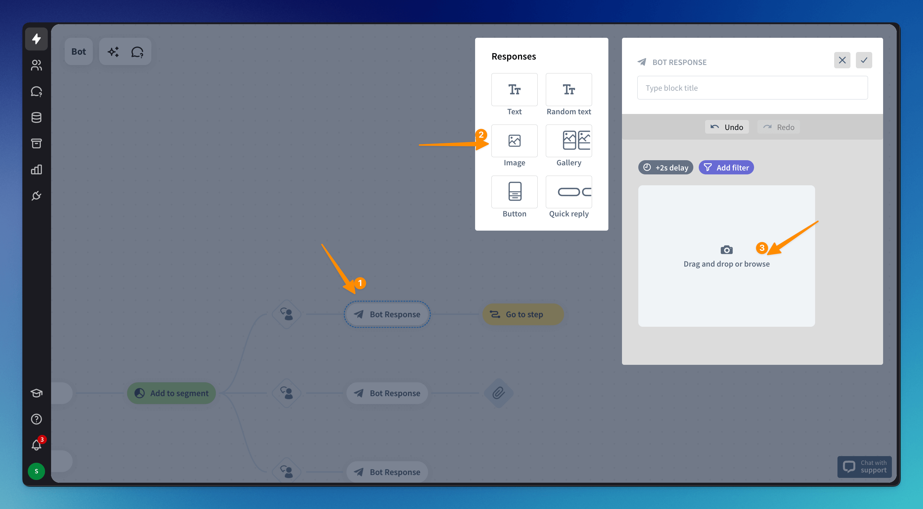 Go to your bot and open the Bot response block. Select the Image response and drag and drop your image. You can also browse your computer files to choose from there.