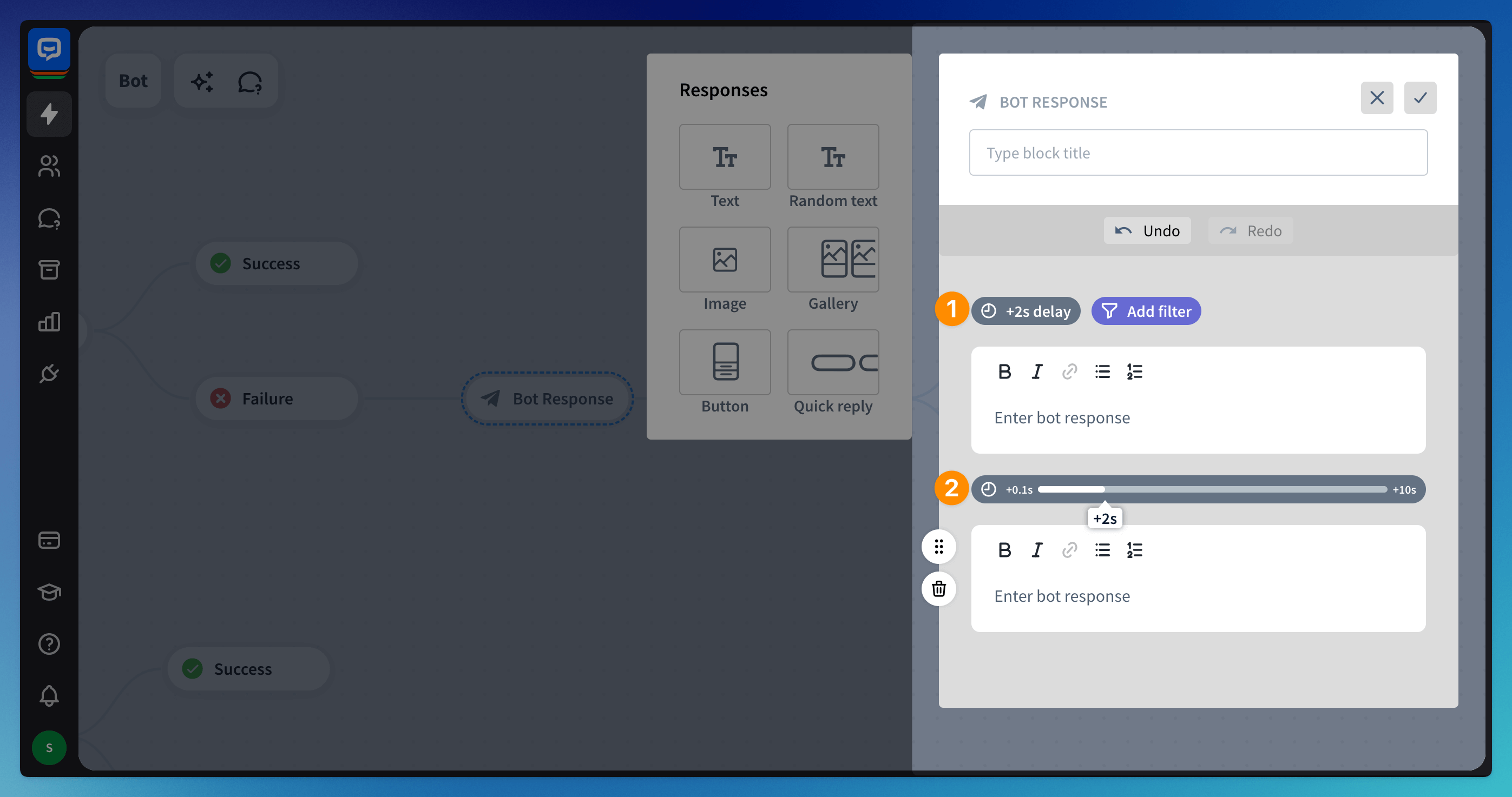 You can see delay button (1) above every bot response. When you click on it, you can adjust the delay on a provided slider (2).