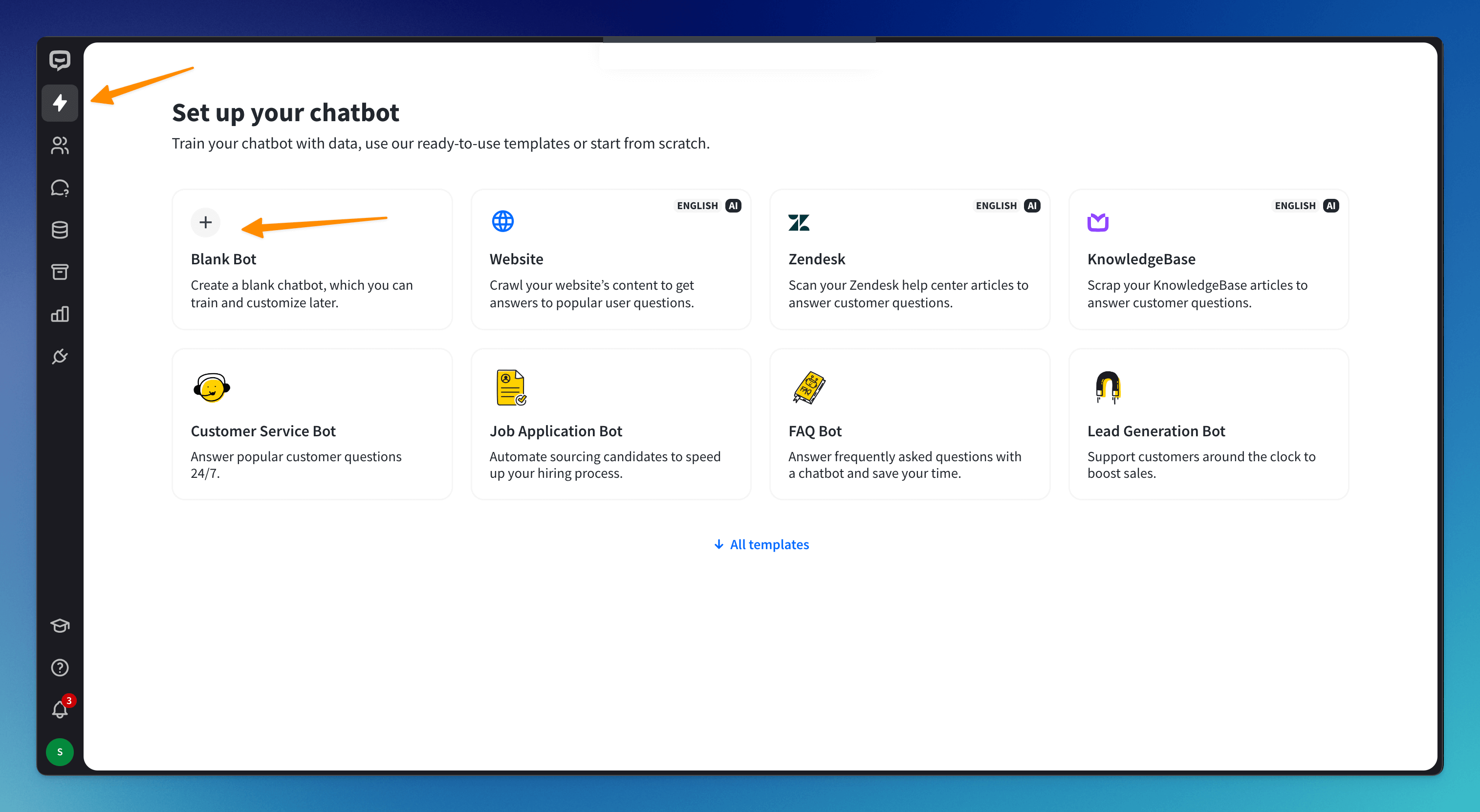 You can create the bot in the Chatbots section of the Dashboard. Click on the Add chatbot button and choose the Blank Bot.