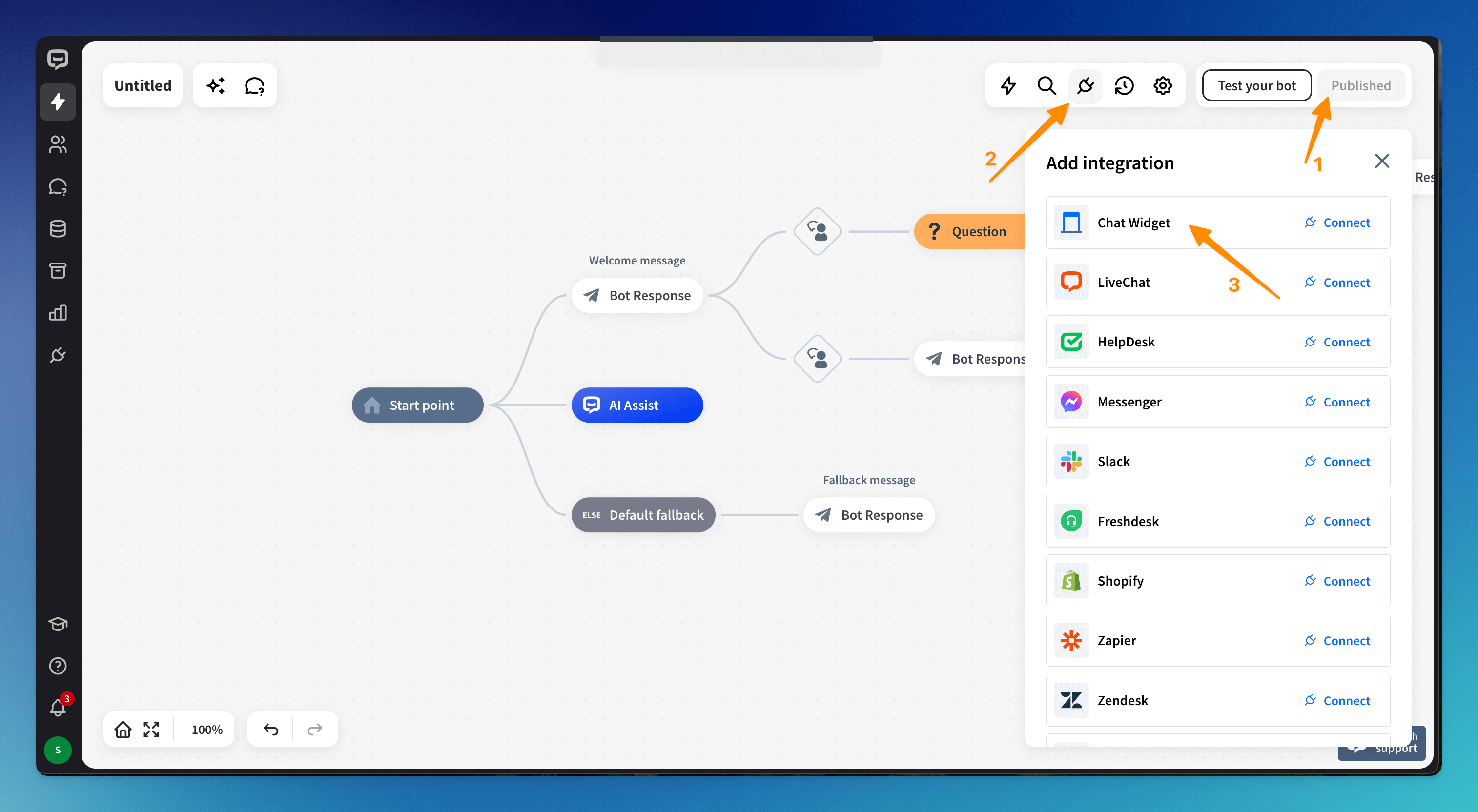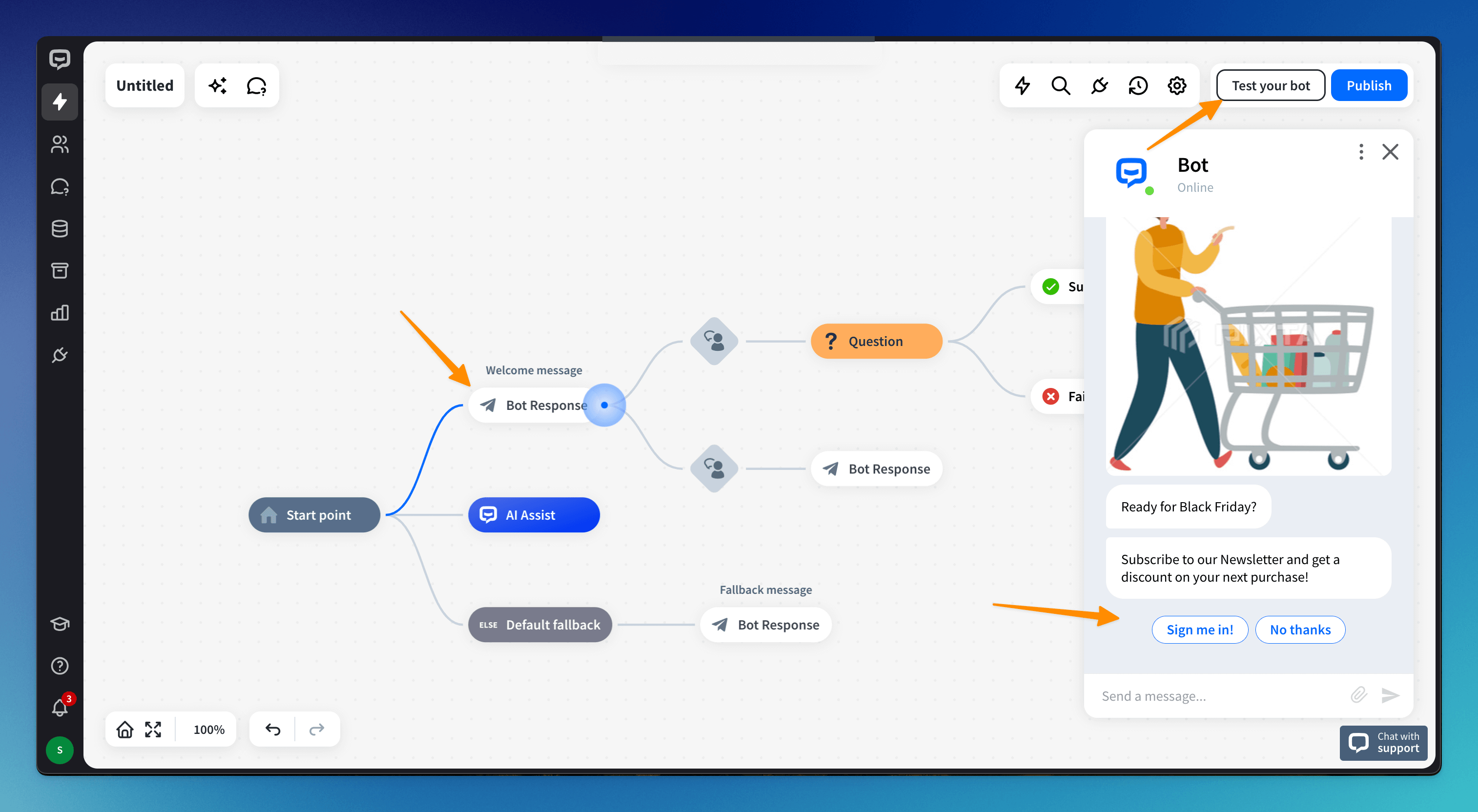 You can test your bot directly in the bot builder. This way, you can detect mistakes much faster and correct them before you show your chatbot to customers.