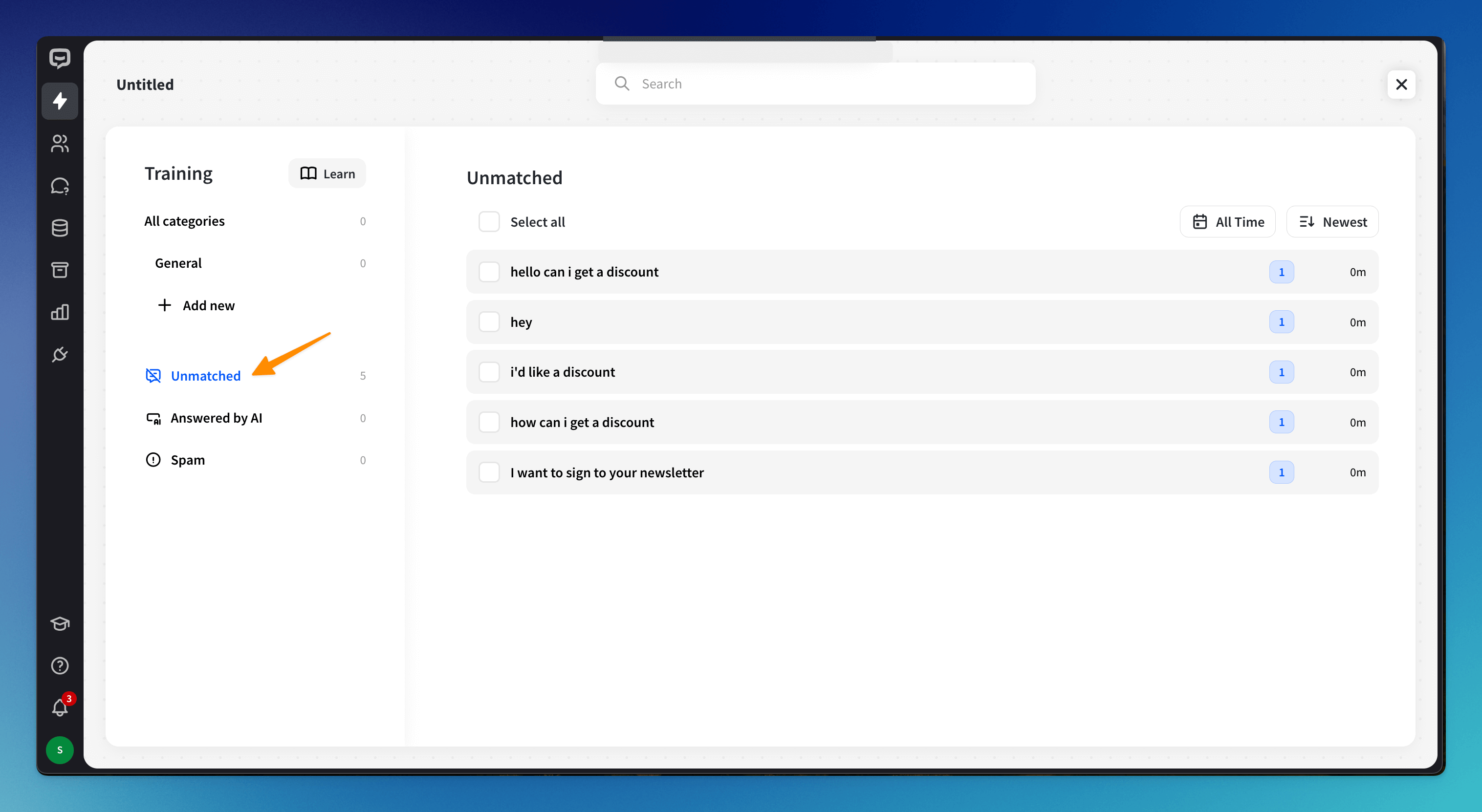 All unmatched interactions that have responded with the fallback interaction are saved in the Unmatched Training module category in the bot builder’s upper left corner. You can add them directly to your chatbot so that your bot can recognize them next time and provide matching replies.