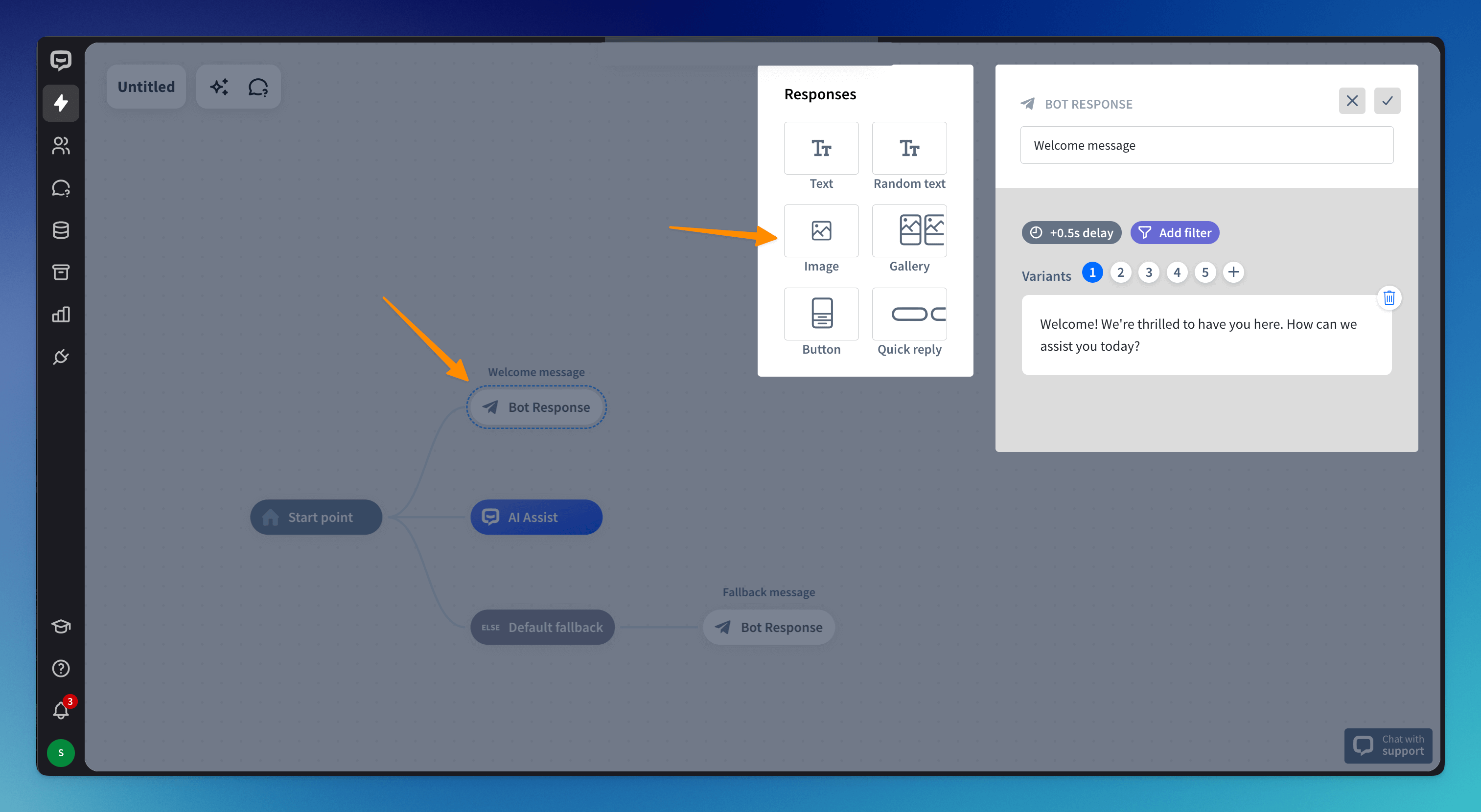You will be taken to a basic bot flow. Click on the Bot response block and edit default welcome messages. Choose an Image response and upload an image.