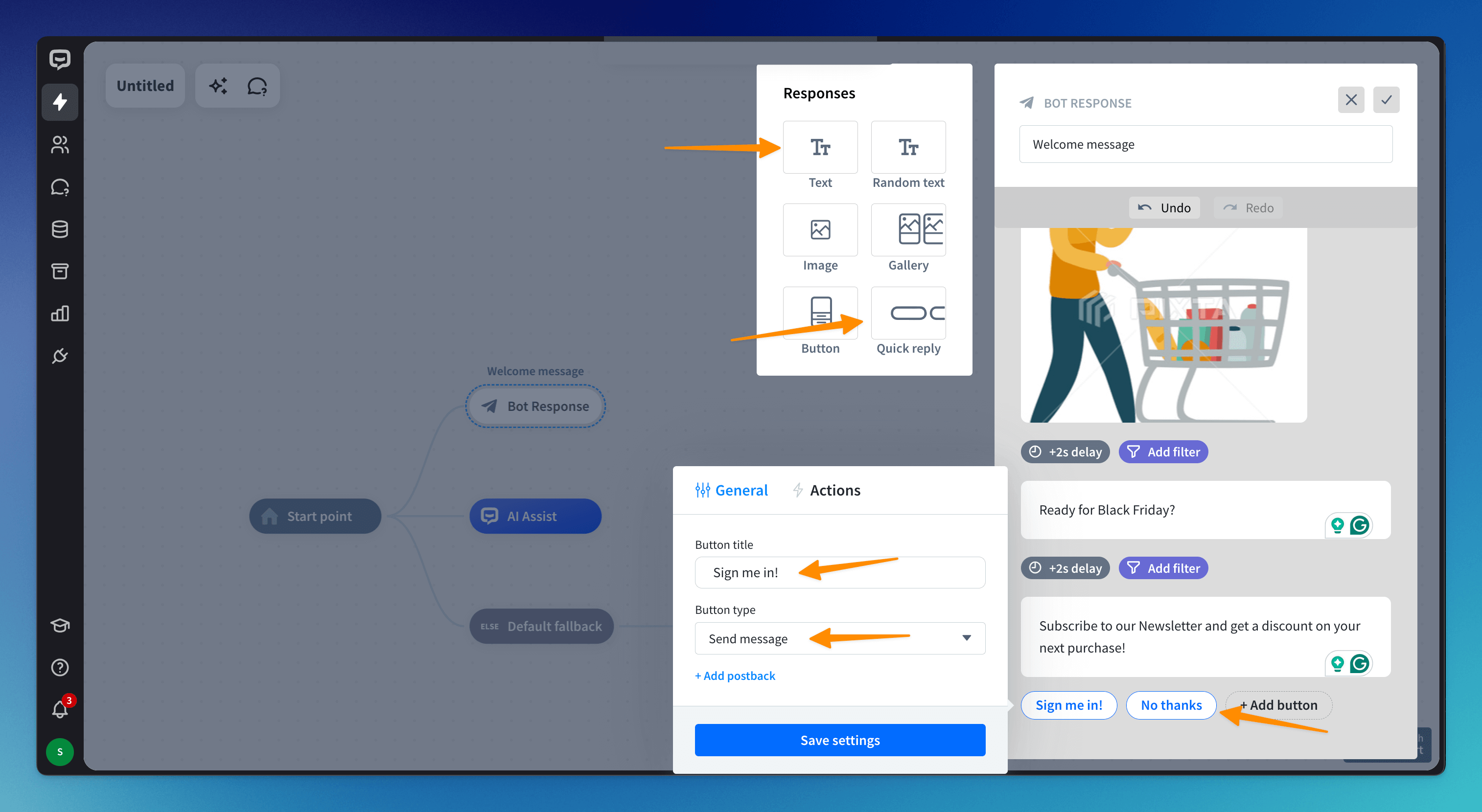 Add a Text response and enter a message. Add a Quick reply response and ask the user whether they want to sign up for your newsletter. Create two buttons—type the buttons’ names and set their types.