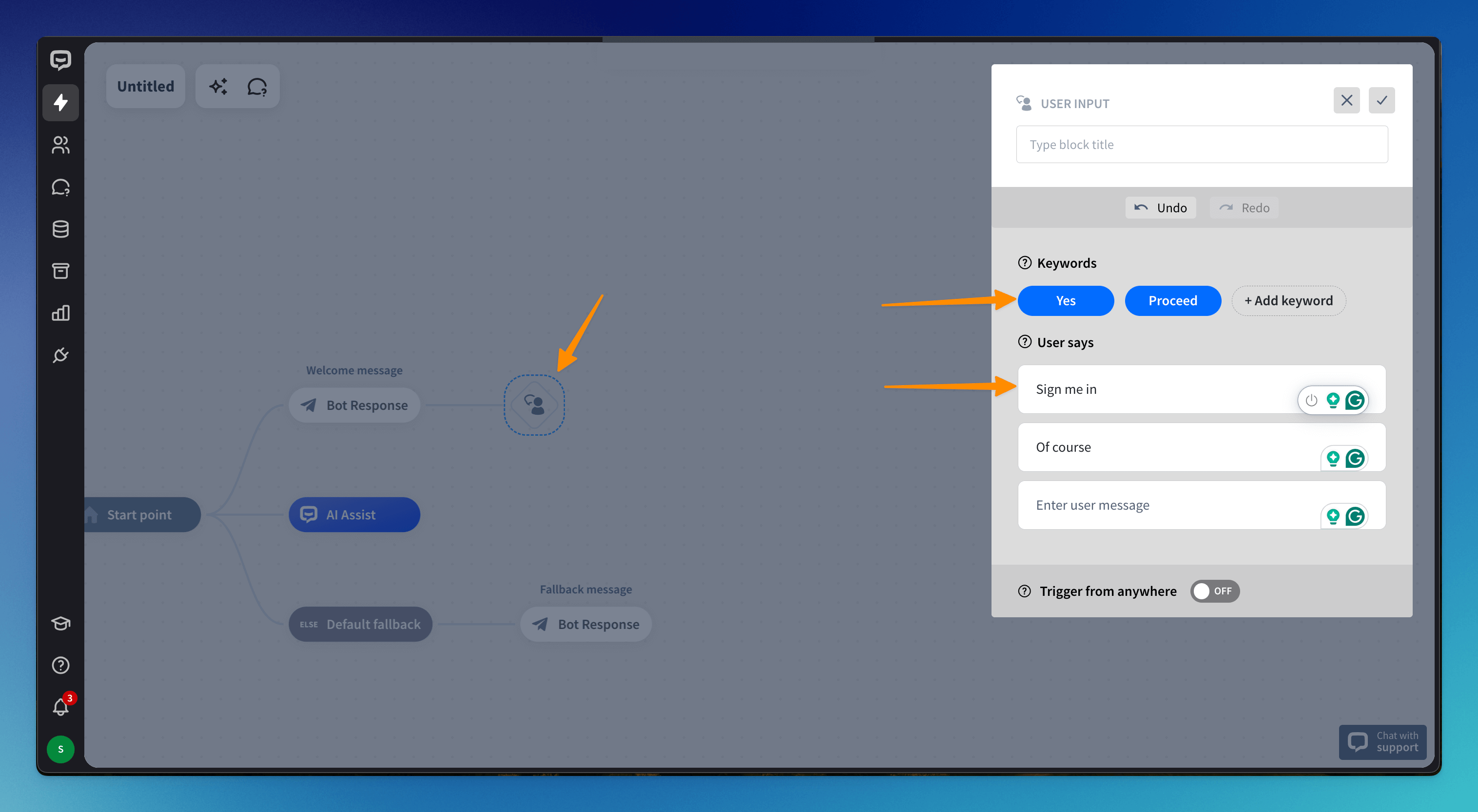 Drag the User input block from the Actions panel under the Thunderbolt icon and drop it after the Bot response block. Click the added block to enter the type of messages that will trigger the chatbot’s next response. You can do that in the Keywords or in the User says section.