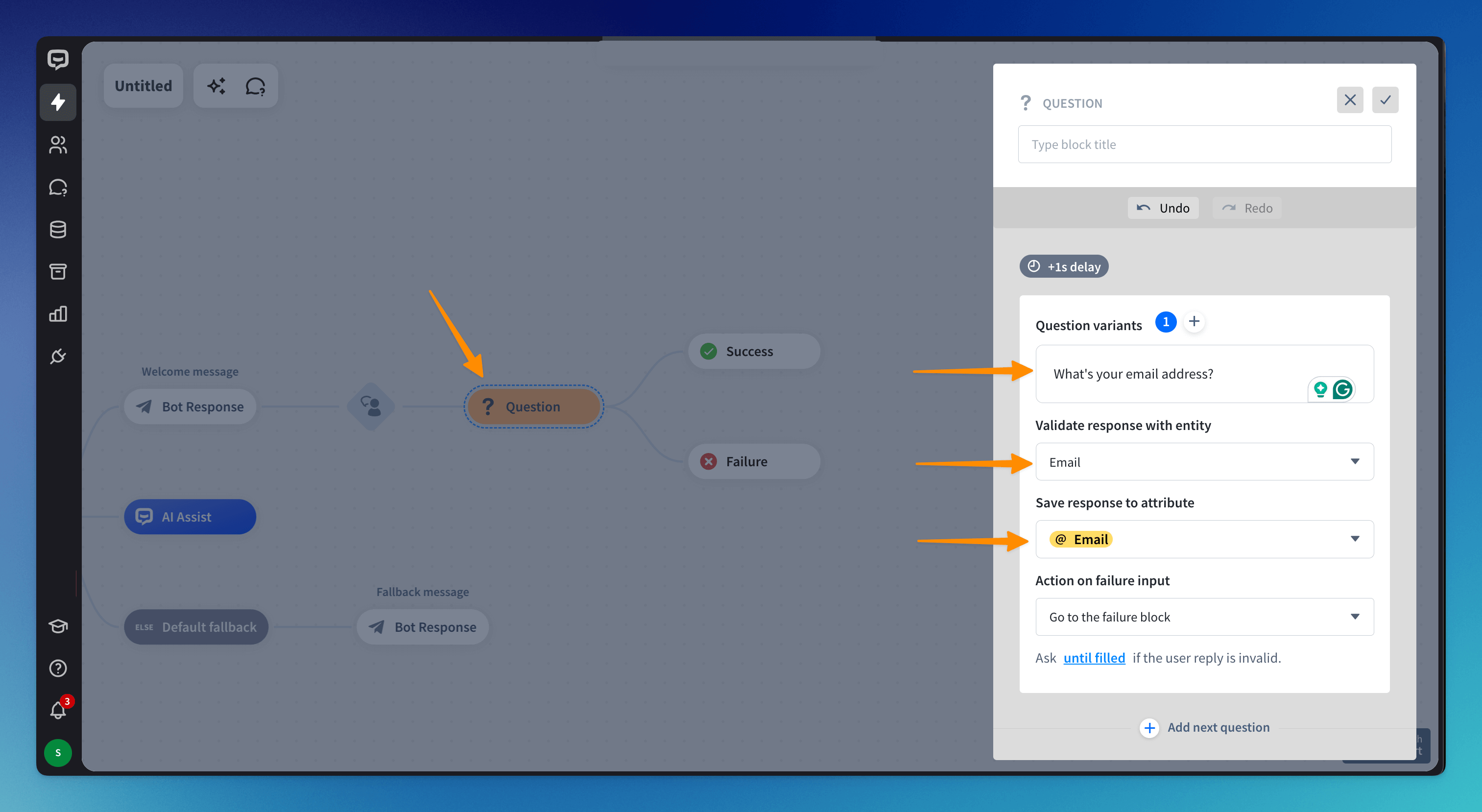 Drag the Question block to collect the email address and drop it after the User input block. Click on the Question block and enter your question. Validate the response with the Email entity. Save the response to the Email attribute. Choose what your bot should do and how many times the bot will ask the question if the user fails to provide the correct format.
