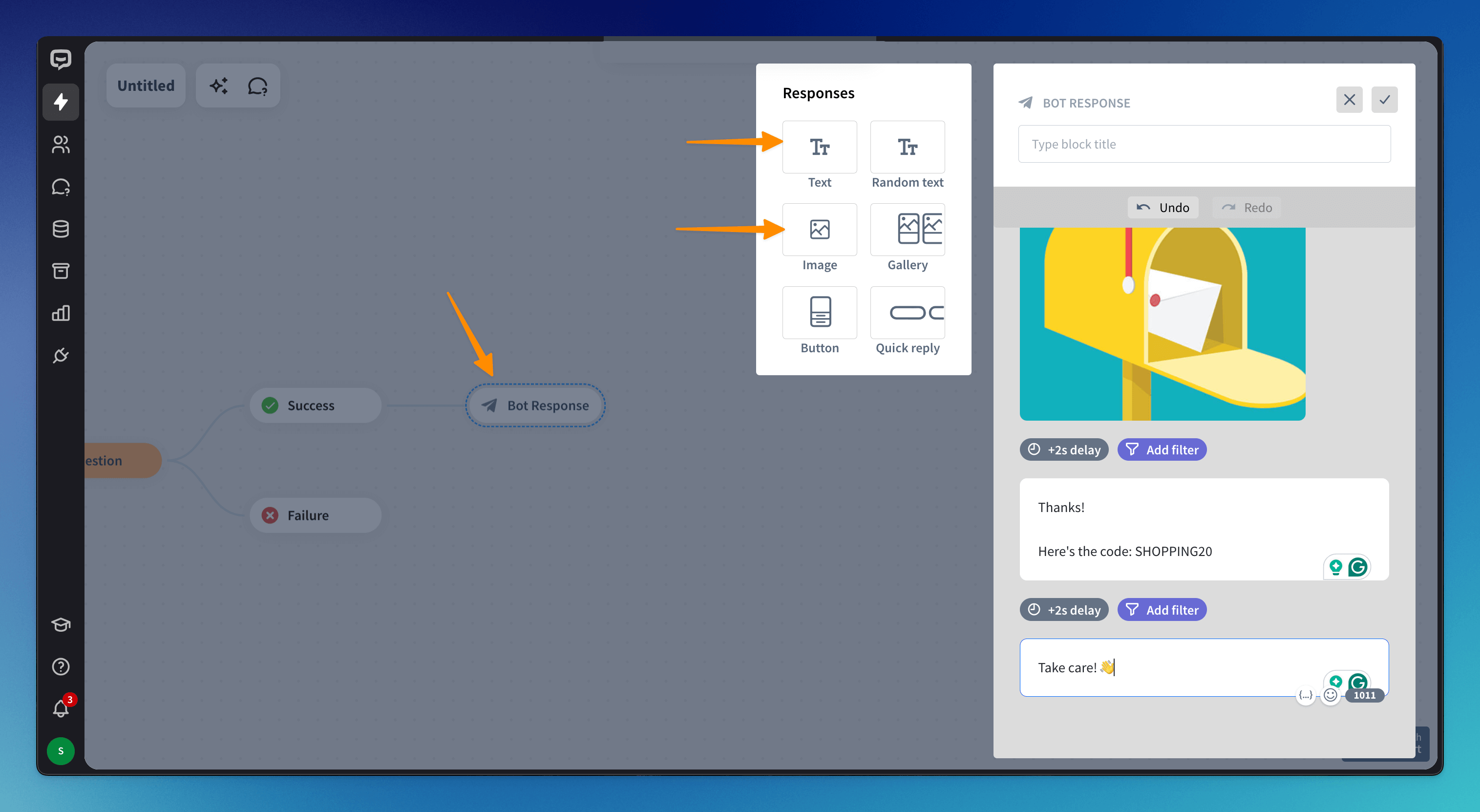 Drag Bot Response and drop it after the Success block. Add an Image response and enter your messages in the Text response.
