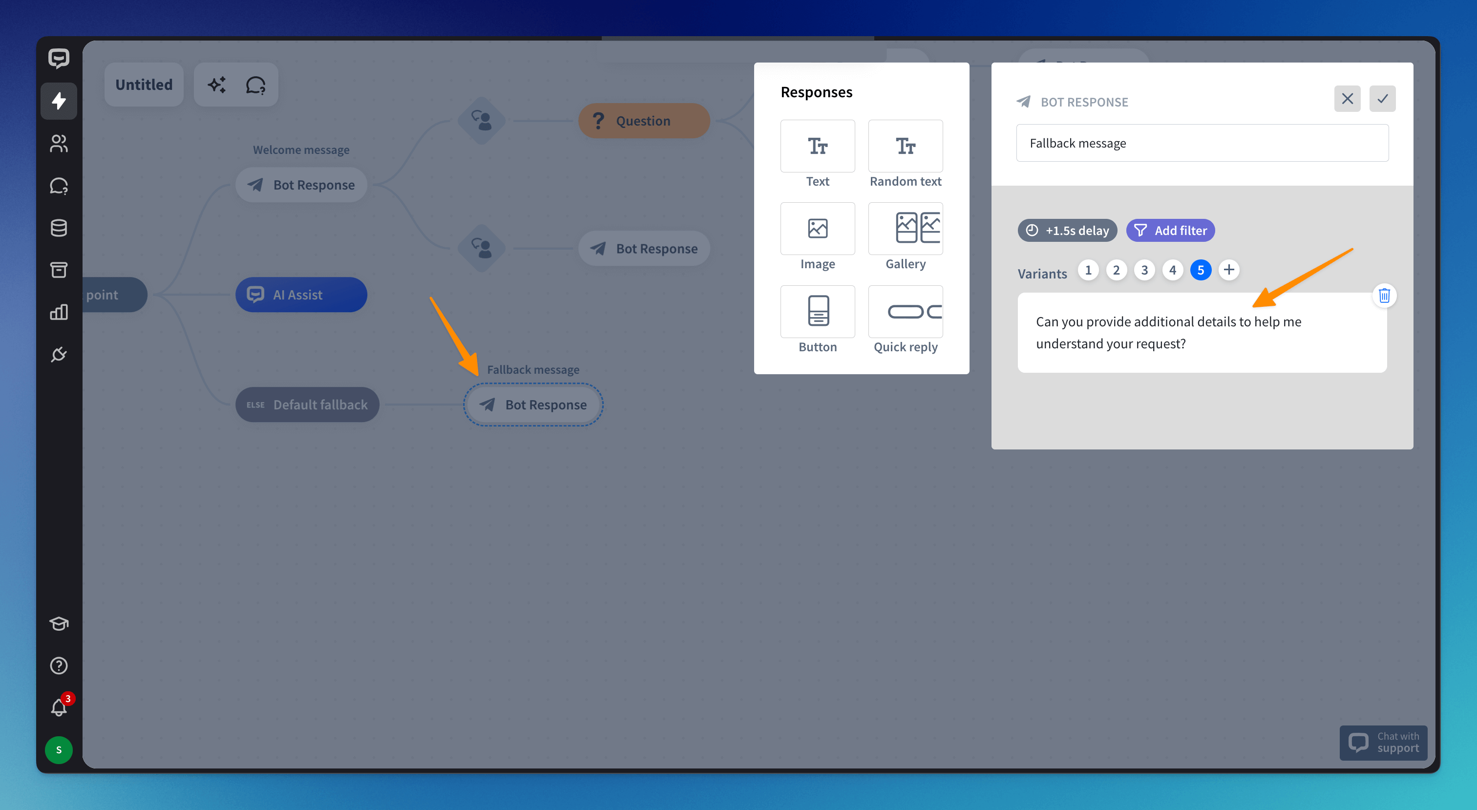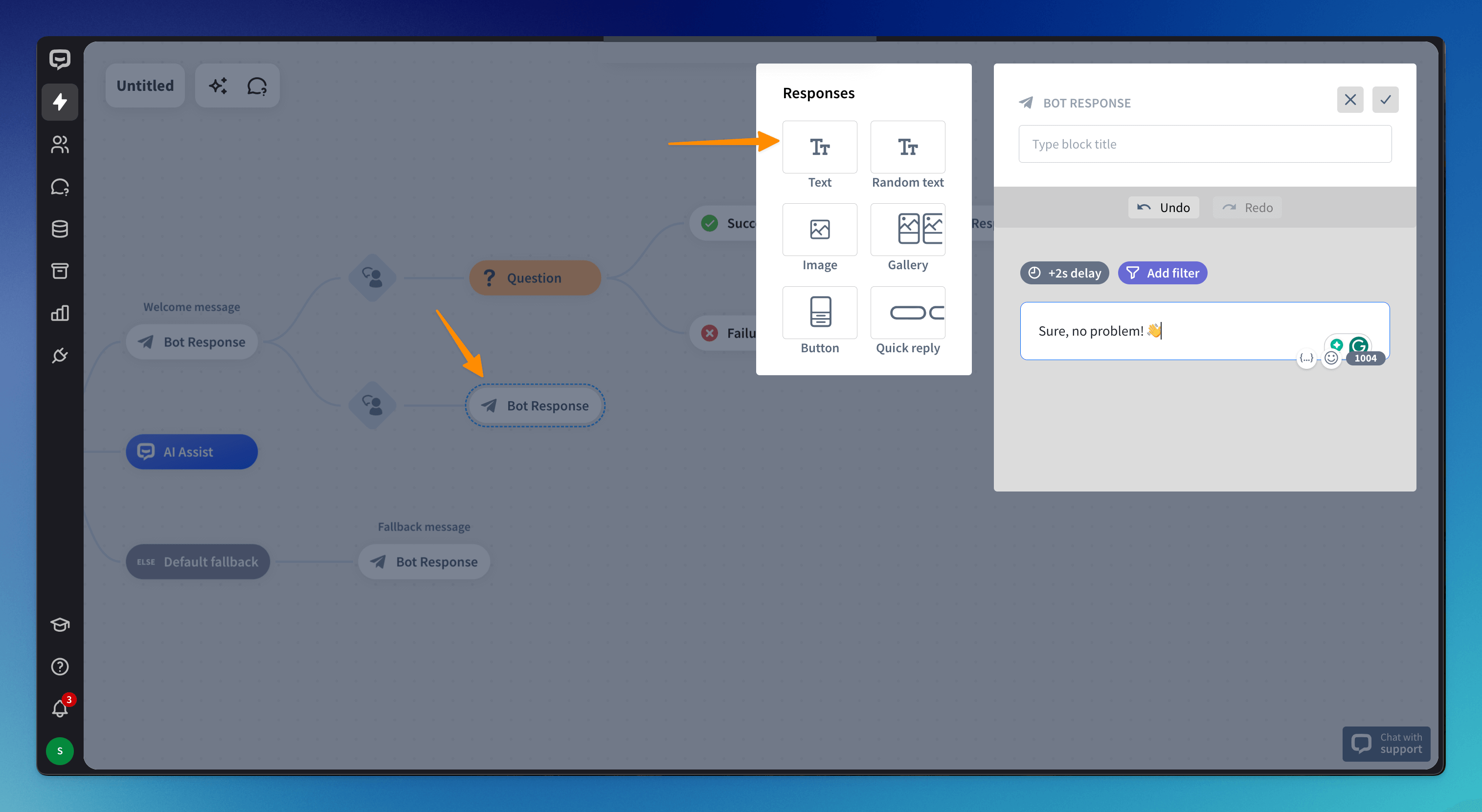 Drag Bot response and drop it after User input. Click on the block and enter the bot’s message.