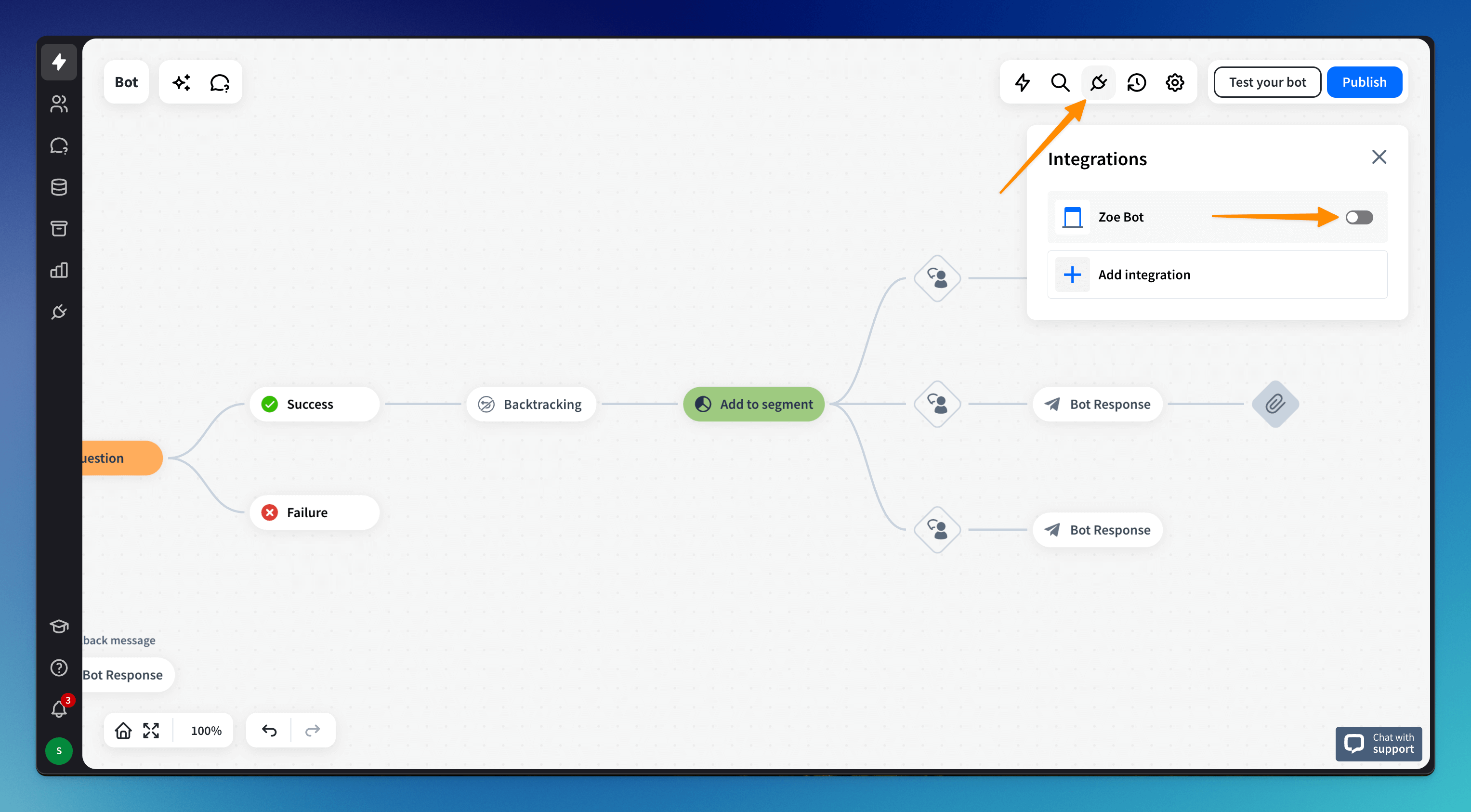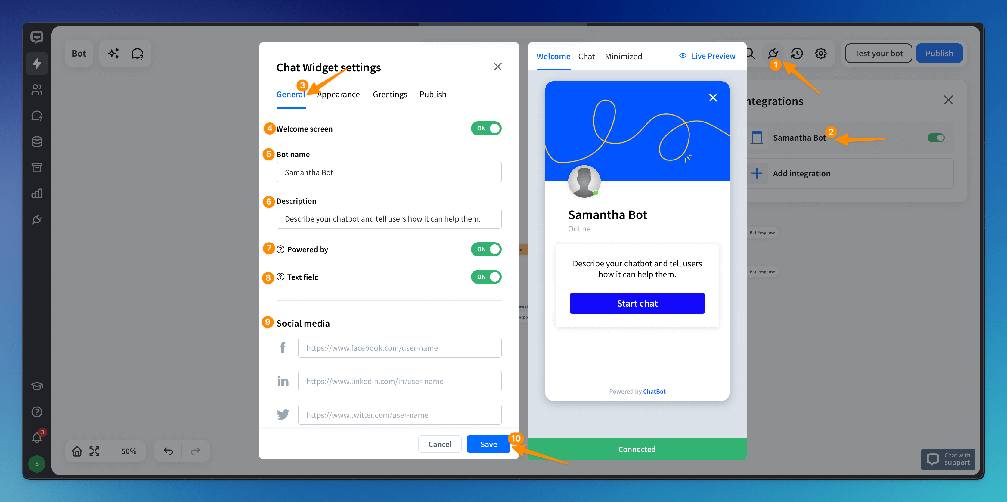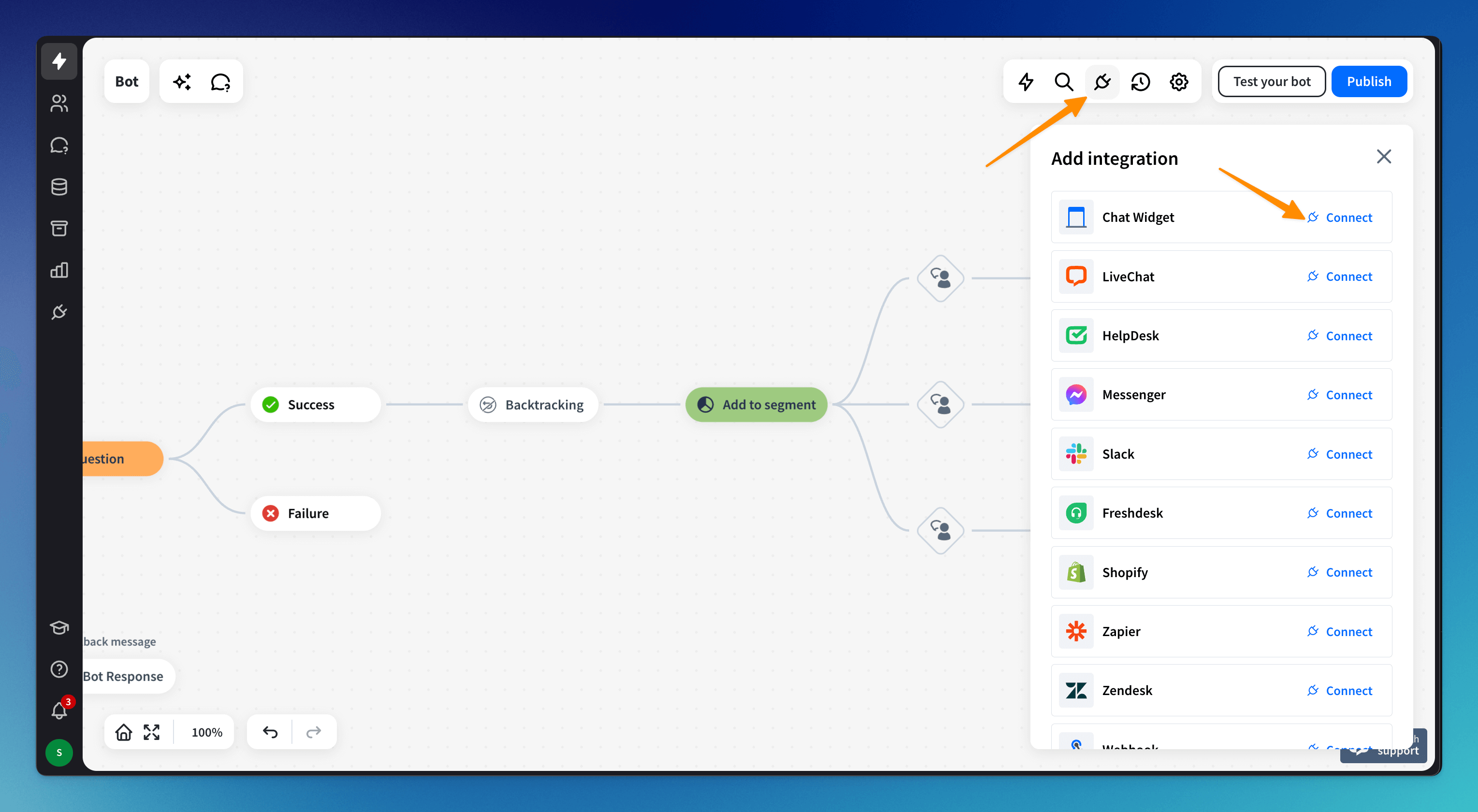 Open your bot and go to the Integrations icon. Click Connect next to the Chat Widget legacy option.