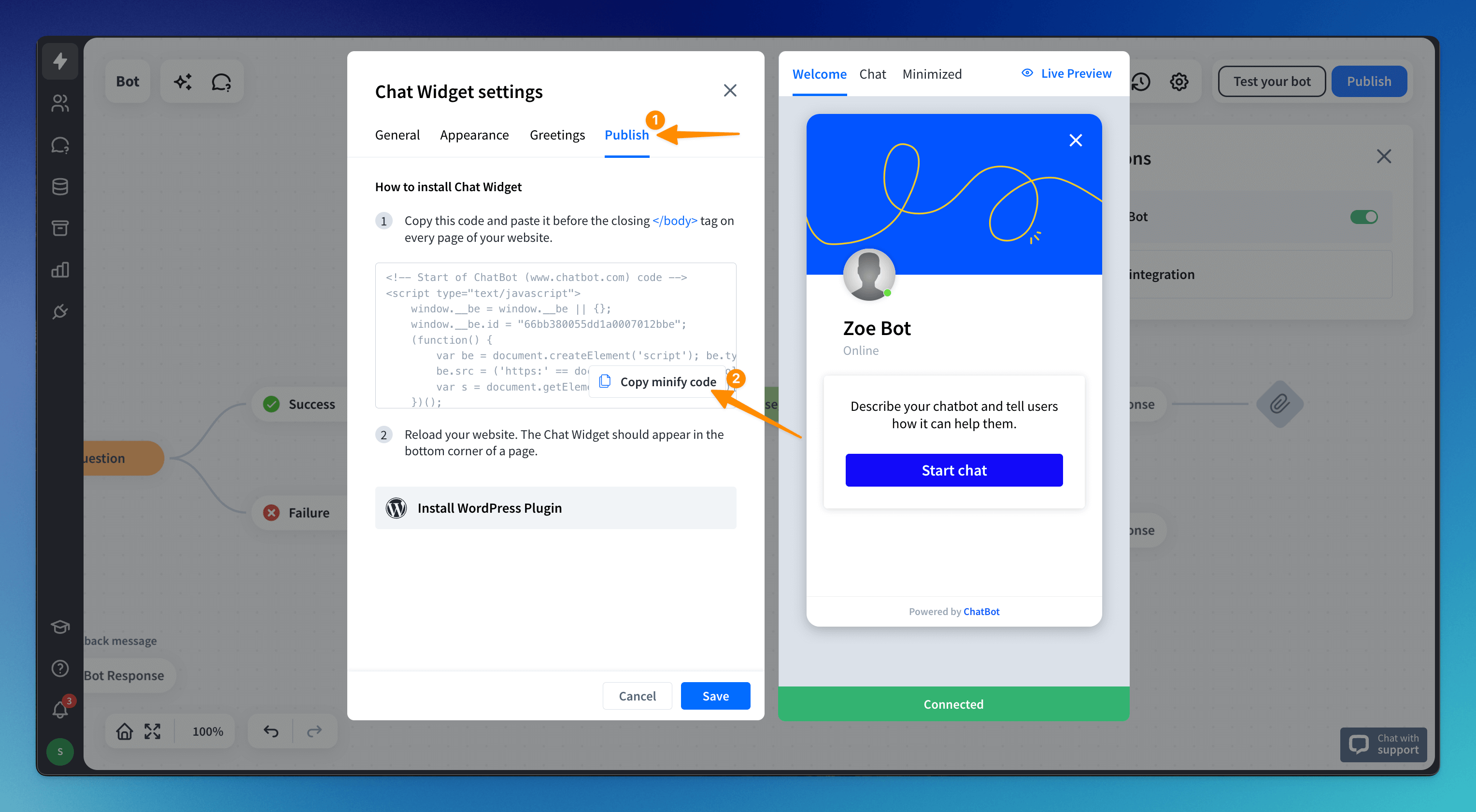 Before you install the bot on your site, you must ensure that all the changes in the bot flow are made. Before you paste the code, you can configure and customize the legacy Chat Widget. The changes will be visible when you save them and publish the bot.