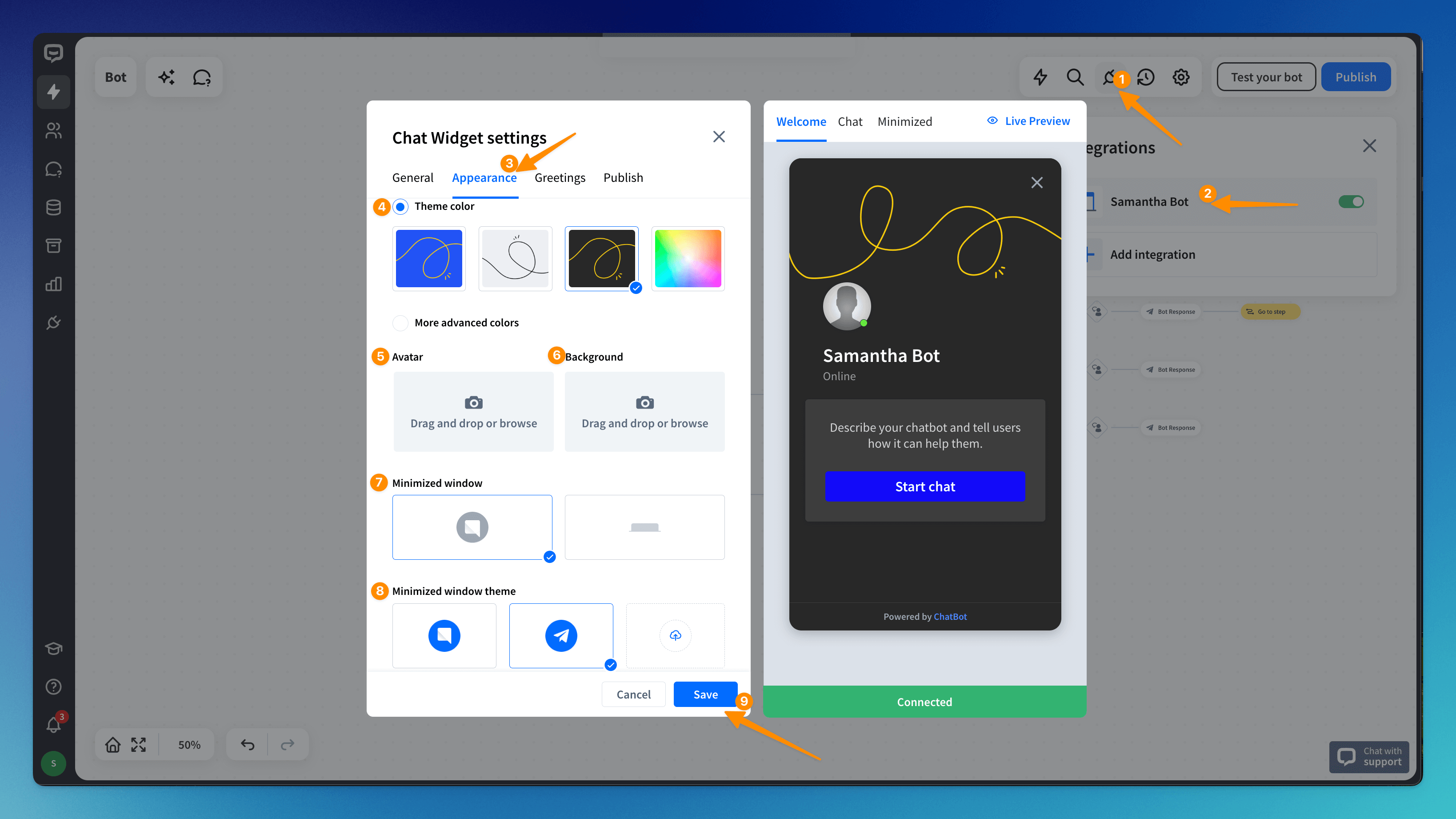 When the bot is integrated with LiveChat, all changes should occur in the LiveChat Chat Widget configurator, which should be installed on your site. See how to customize the LiveChat Chat Widget.