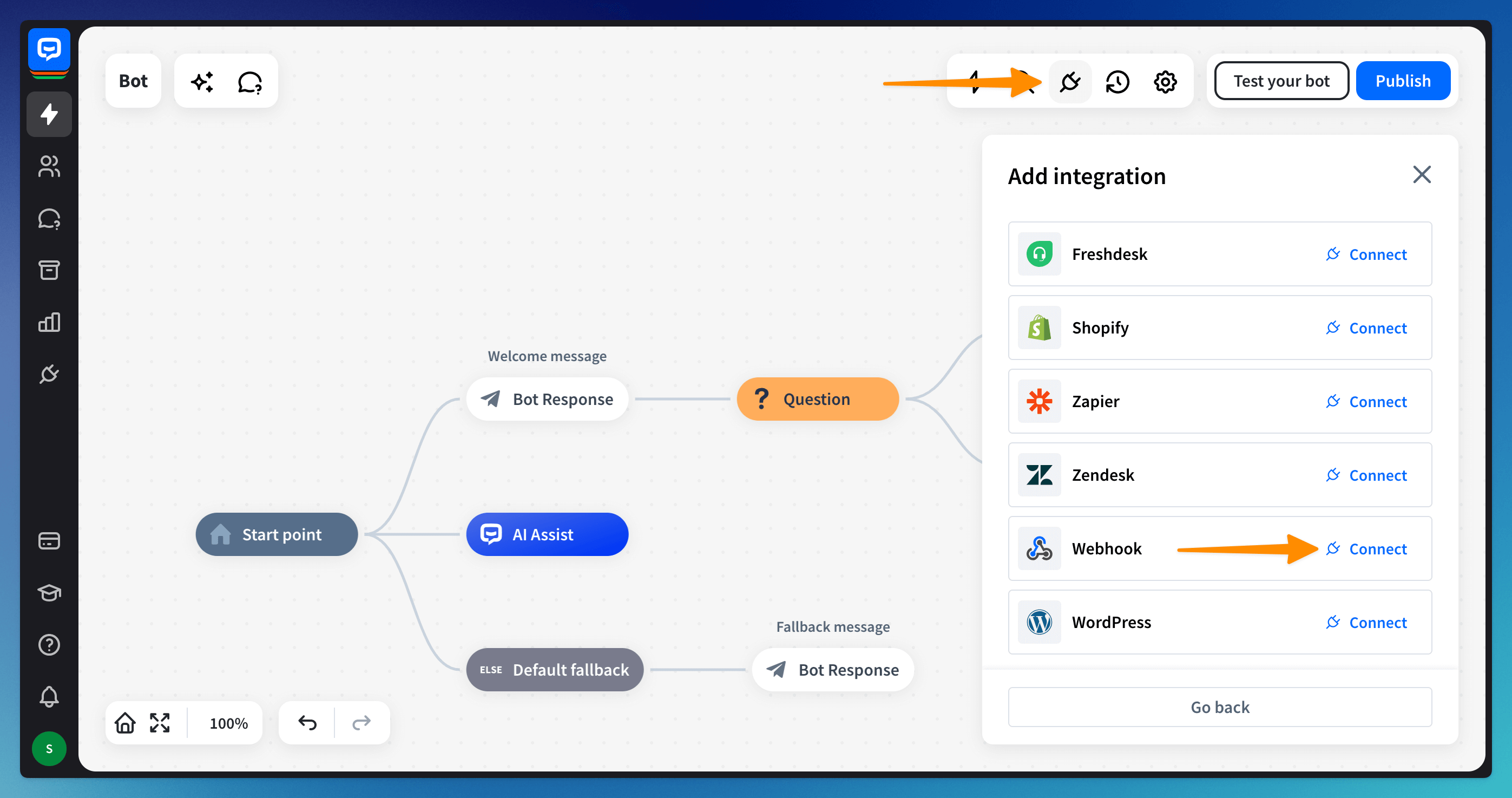 Go to your bot, open the Integrations panel, and choose the Webhook option from the list. Proceed with the Connect button.