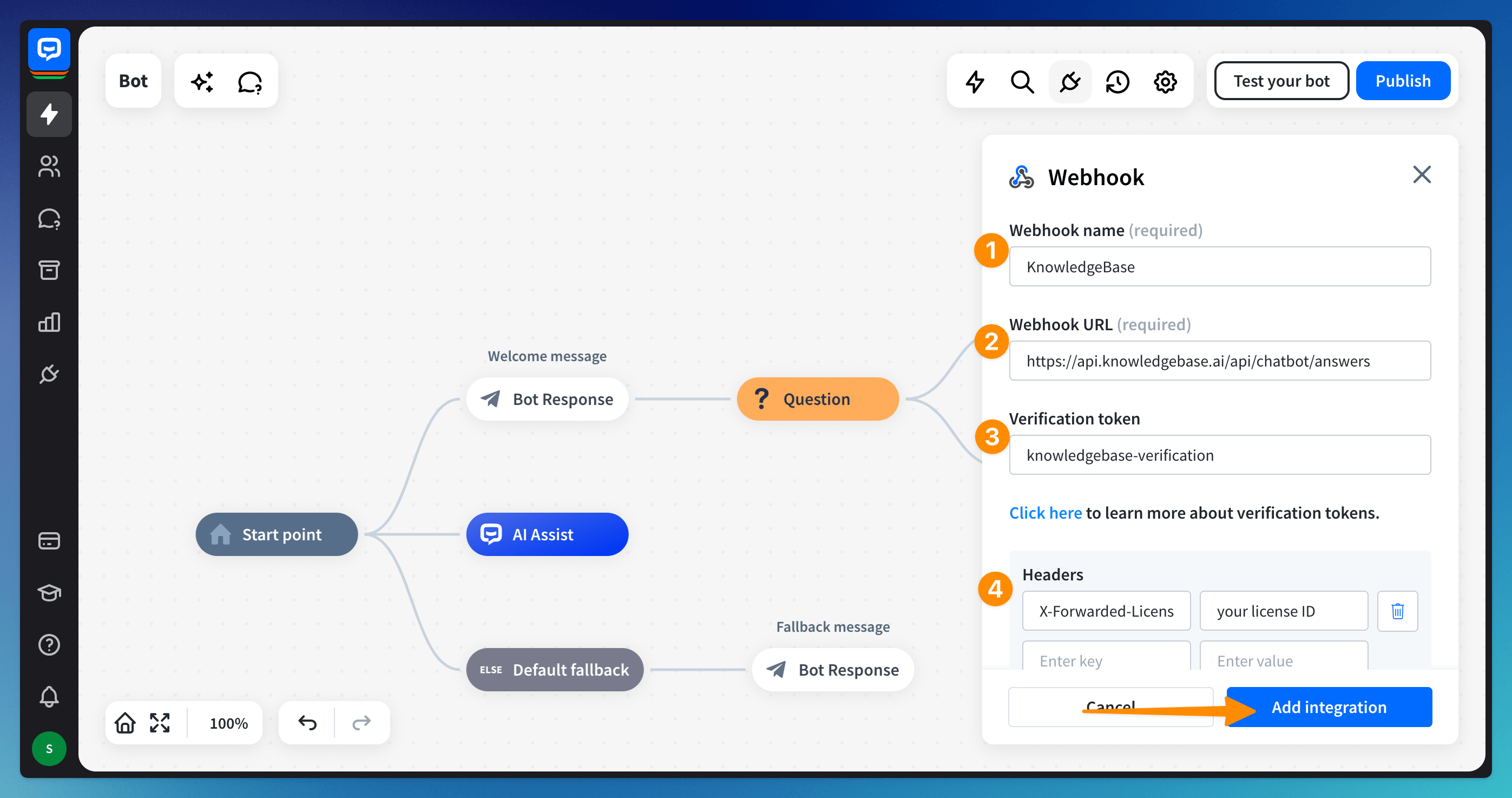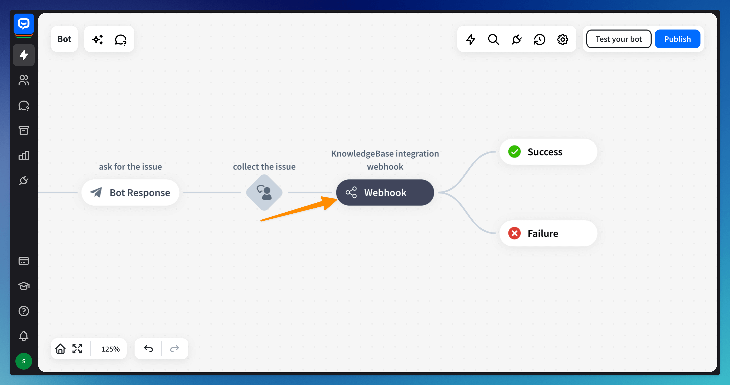 When the webhook is created and the integration is active, you must place it correctly in the bot flow. The bot will display the articles only when the block is triggered on the bot flow.