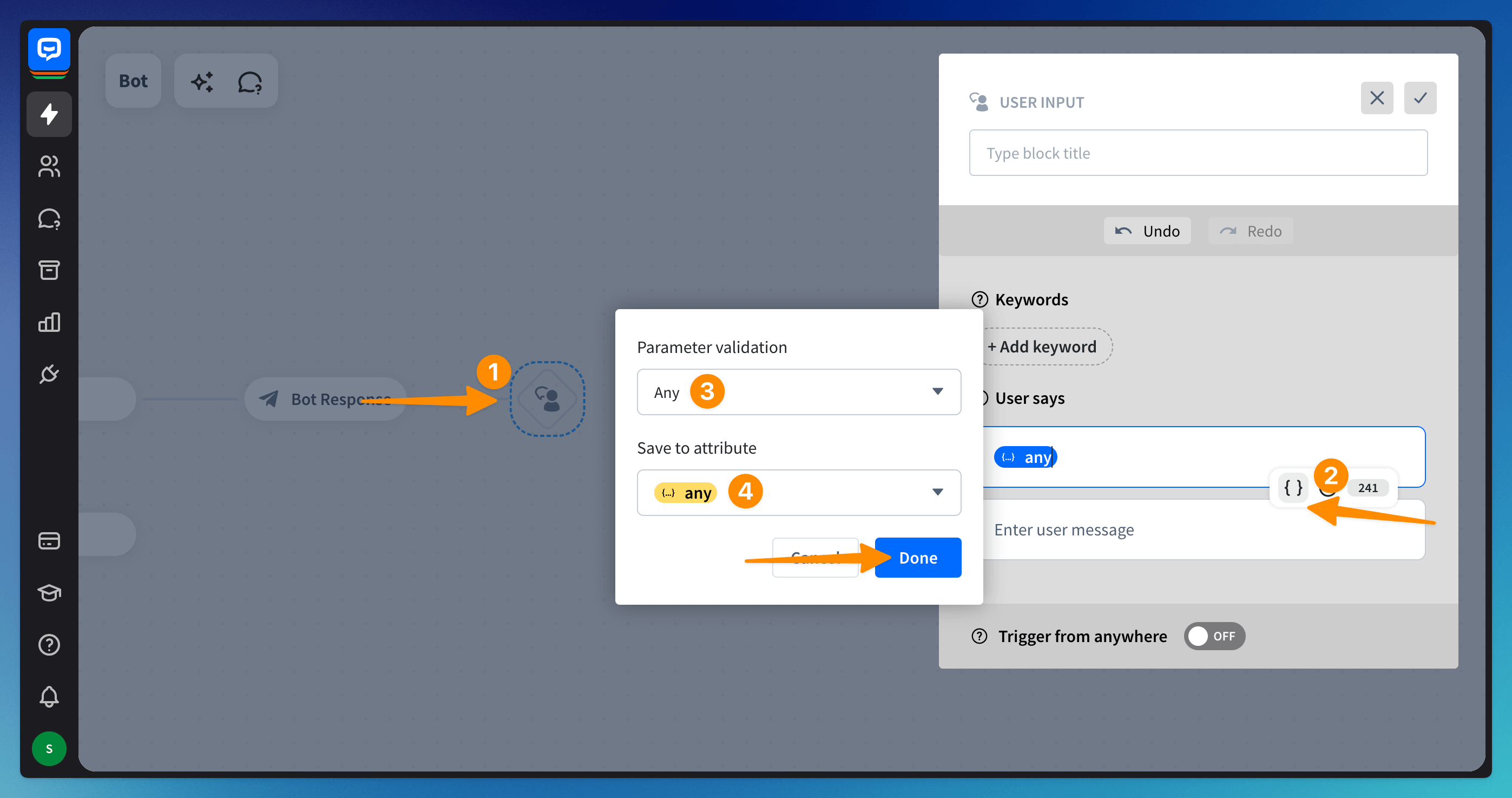 Add a User input block (1) to the bot flow. Add an attribute (2) to collect the user’s question - choose the Any Entity (3) to collect the whole user response, and choose an attribute from the list, or add your custom attribute (4).
