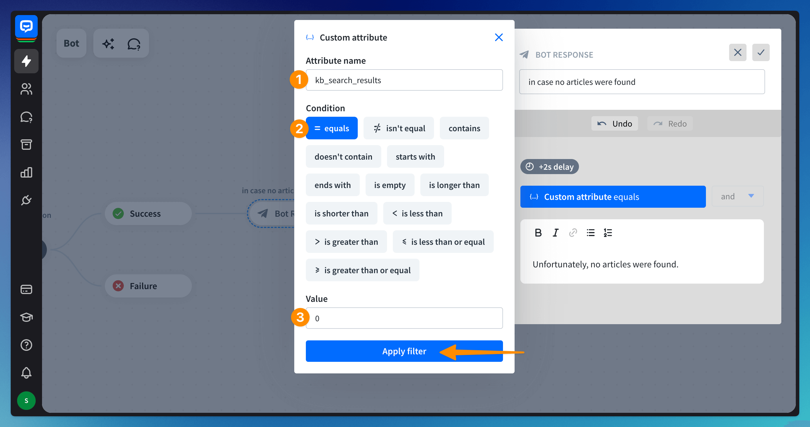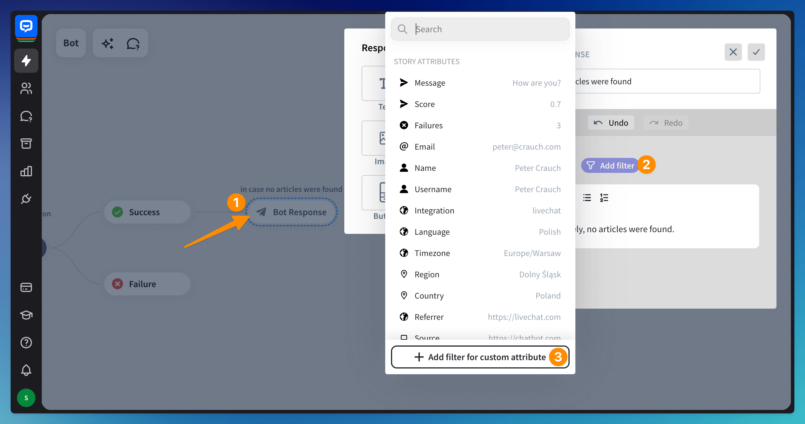 To cover such cases, add a Bot response block after the Webhook’s Success block (1). Enter your response about not having an answer and select Add filter (2) button above the message. Choose an option to Add a custom attribute (3).