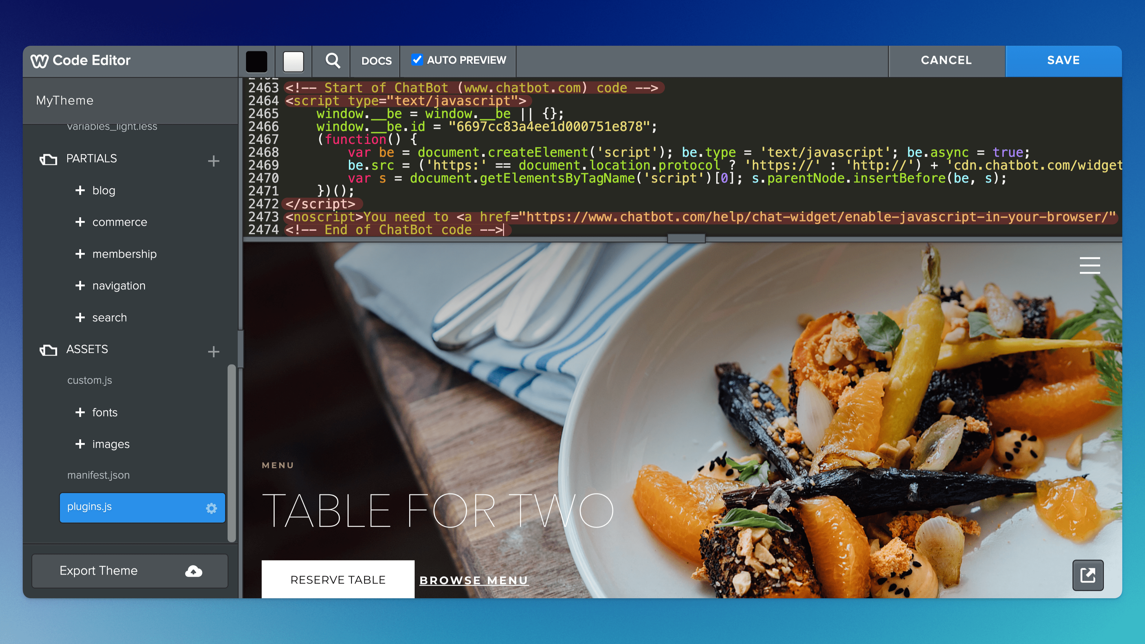Select plugins.js from the list on the left. Paste the copied chat widget code into the appropriate field, then delete the red-highlighted parts (keep only what’s after