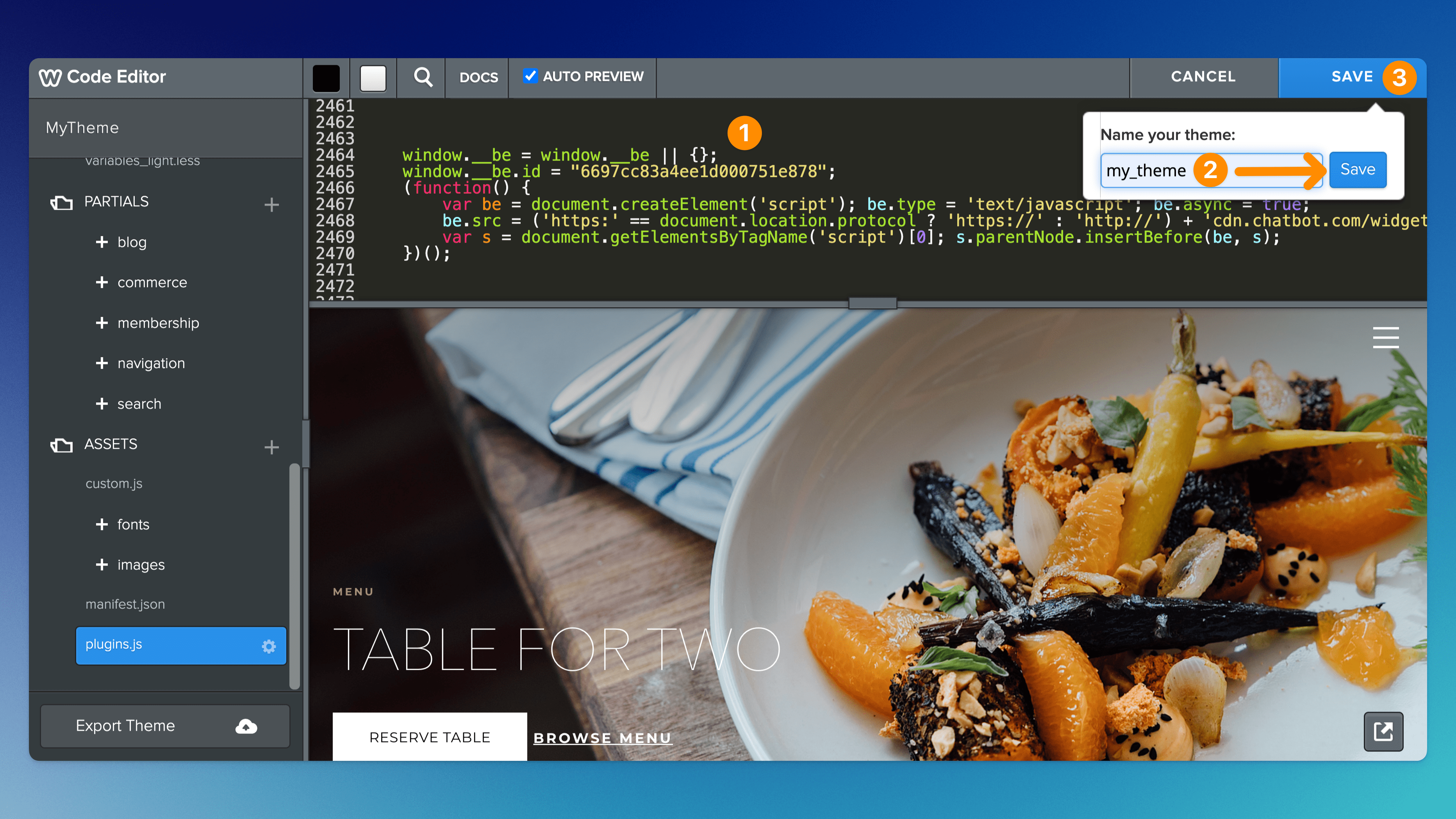 Ensure the code looks like the example below (1). Then, name and save your theme (2), and click Save in the upper right corner (3).