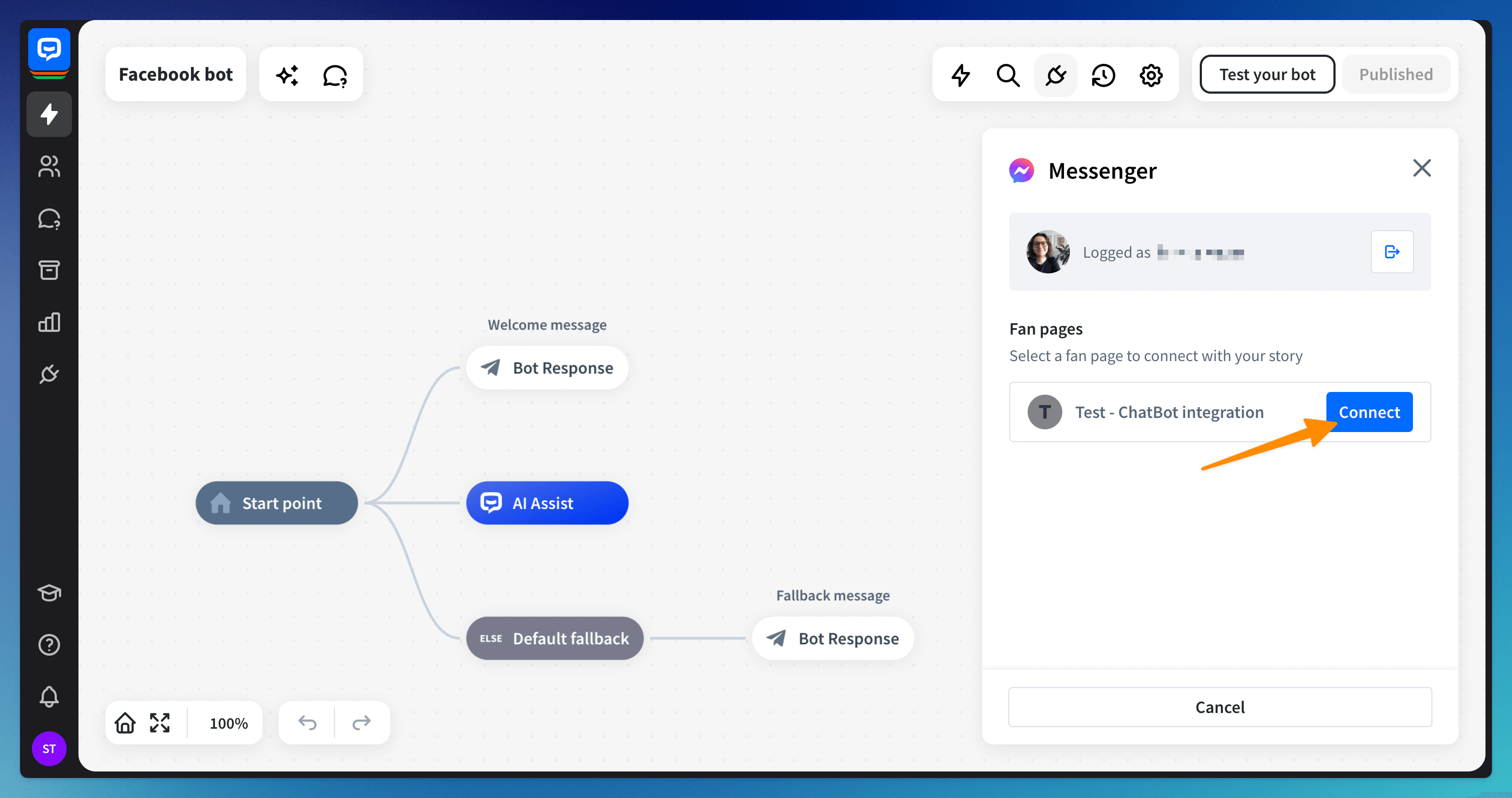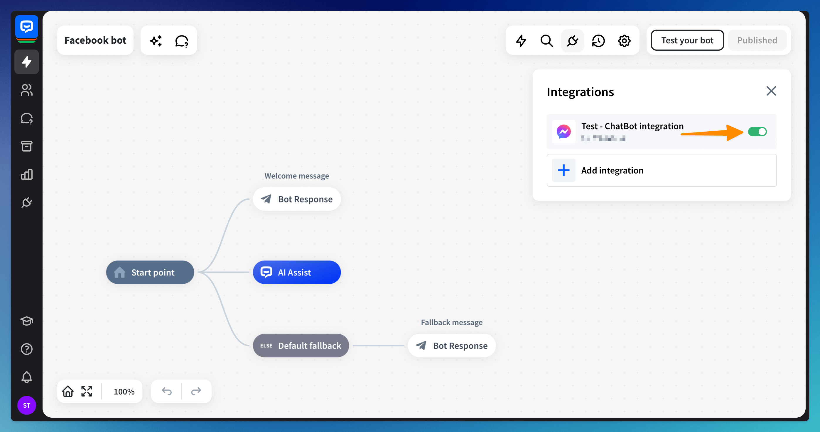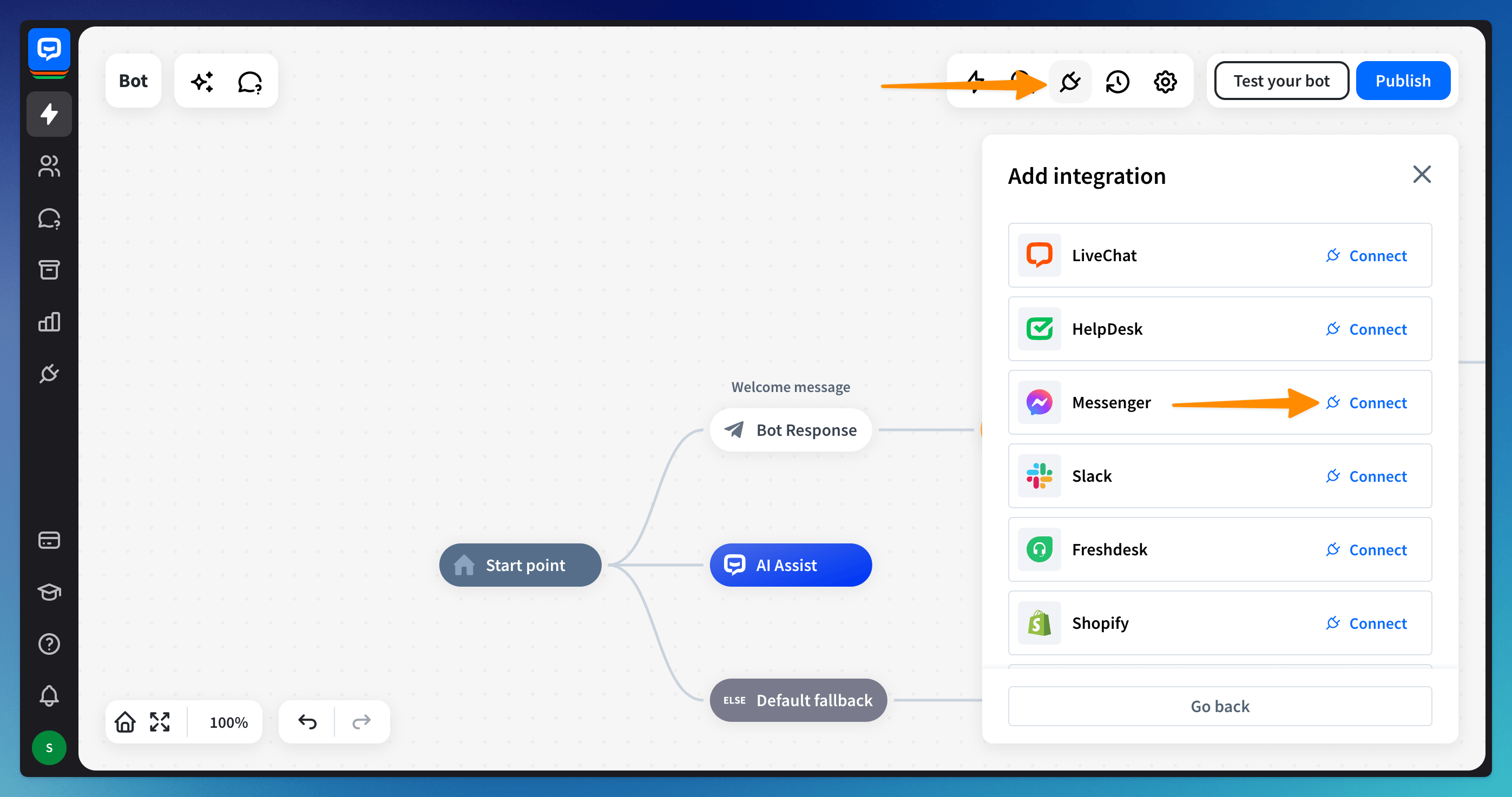 Go to your bot and open the Integrations panel. Choose Messenger from the list.