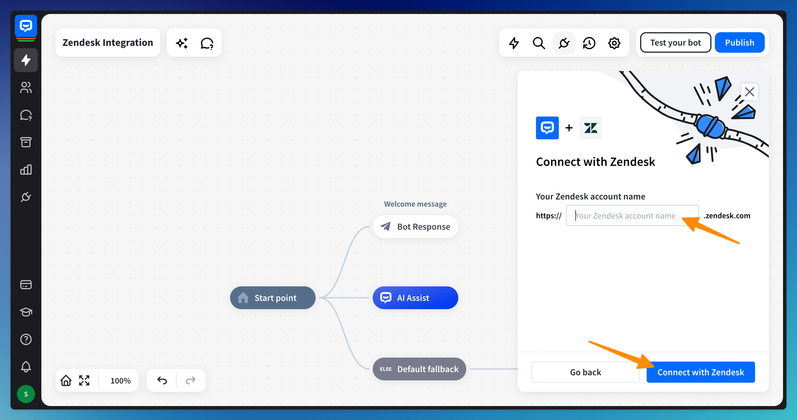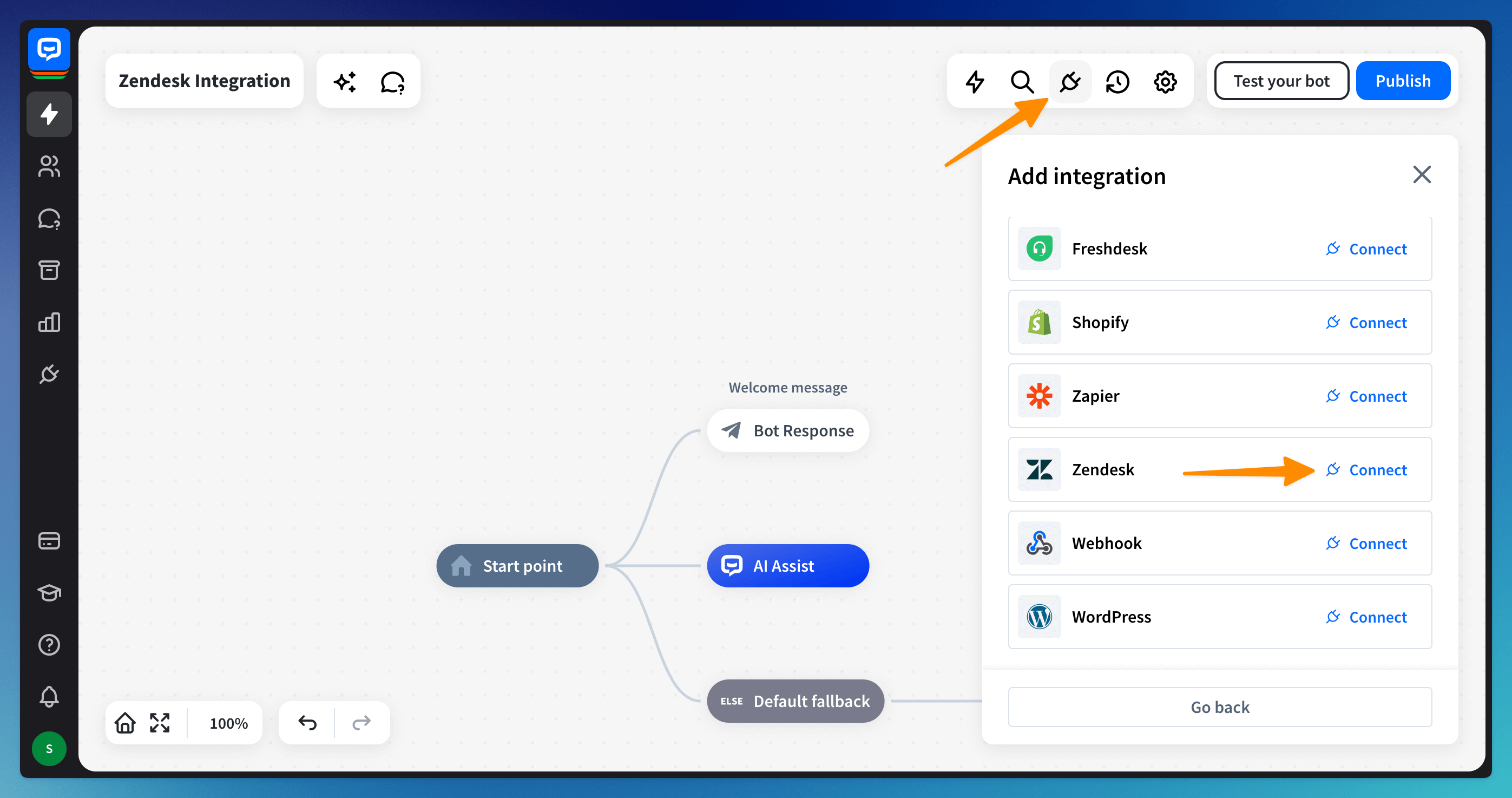 Go to your bot and open the Integration menu. Choose the Zendesk integration with the Connect button.