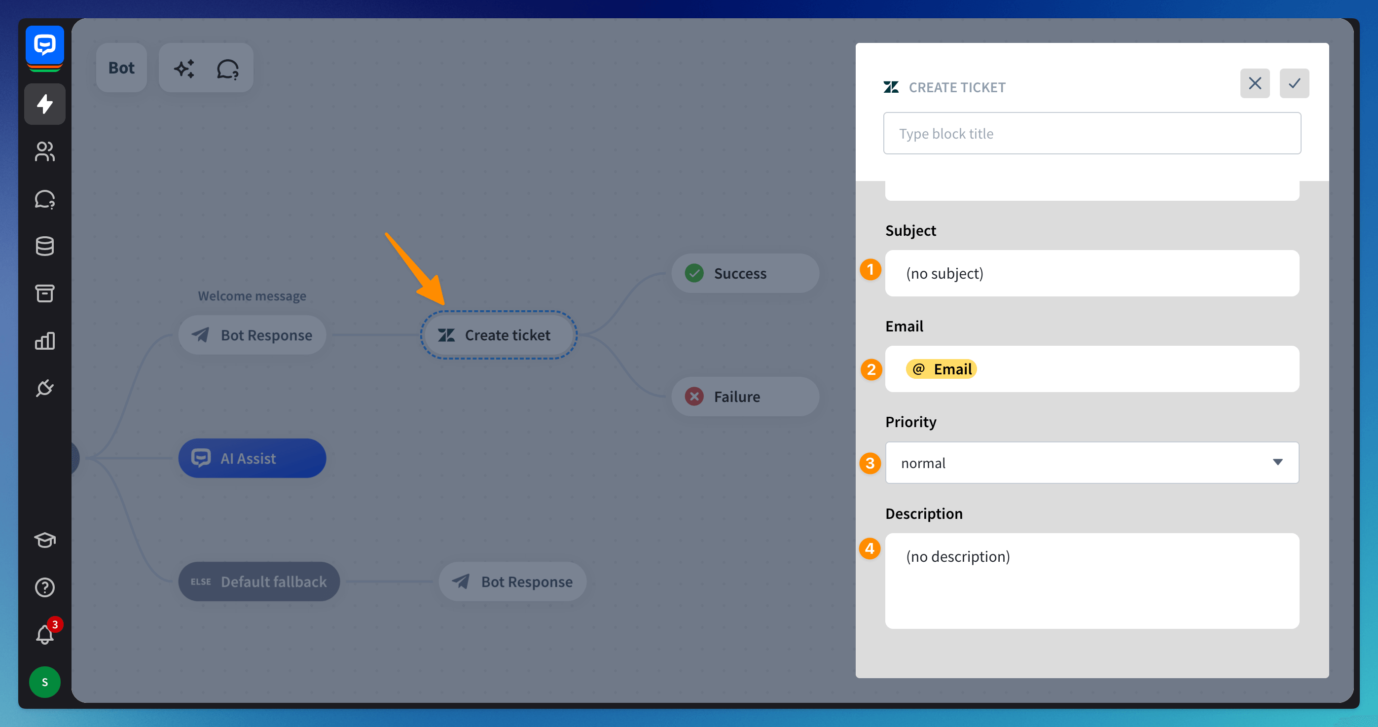 The Create ticket action for Zendesk lets you create tickets from your customers’ chats with your chatbot. You must first connect your Zendesk account to ChatBot to use this action.
