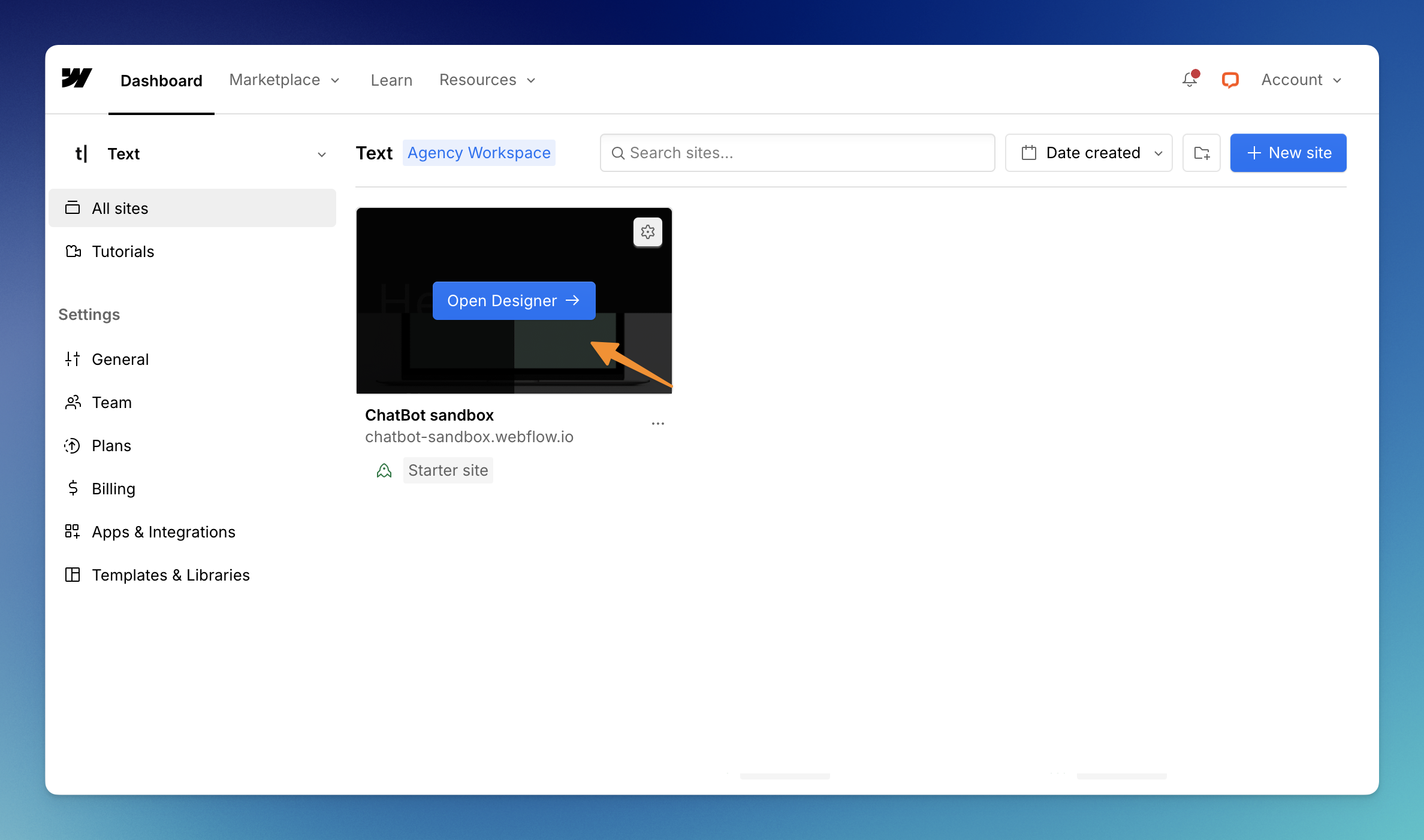 3. Log in to your Webflow account and select View dashboard. Select the page on which you want to add a bot.