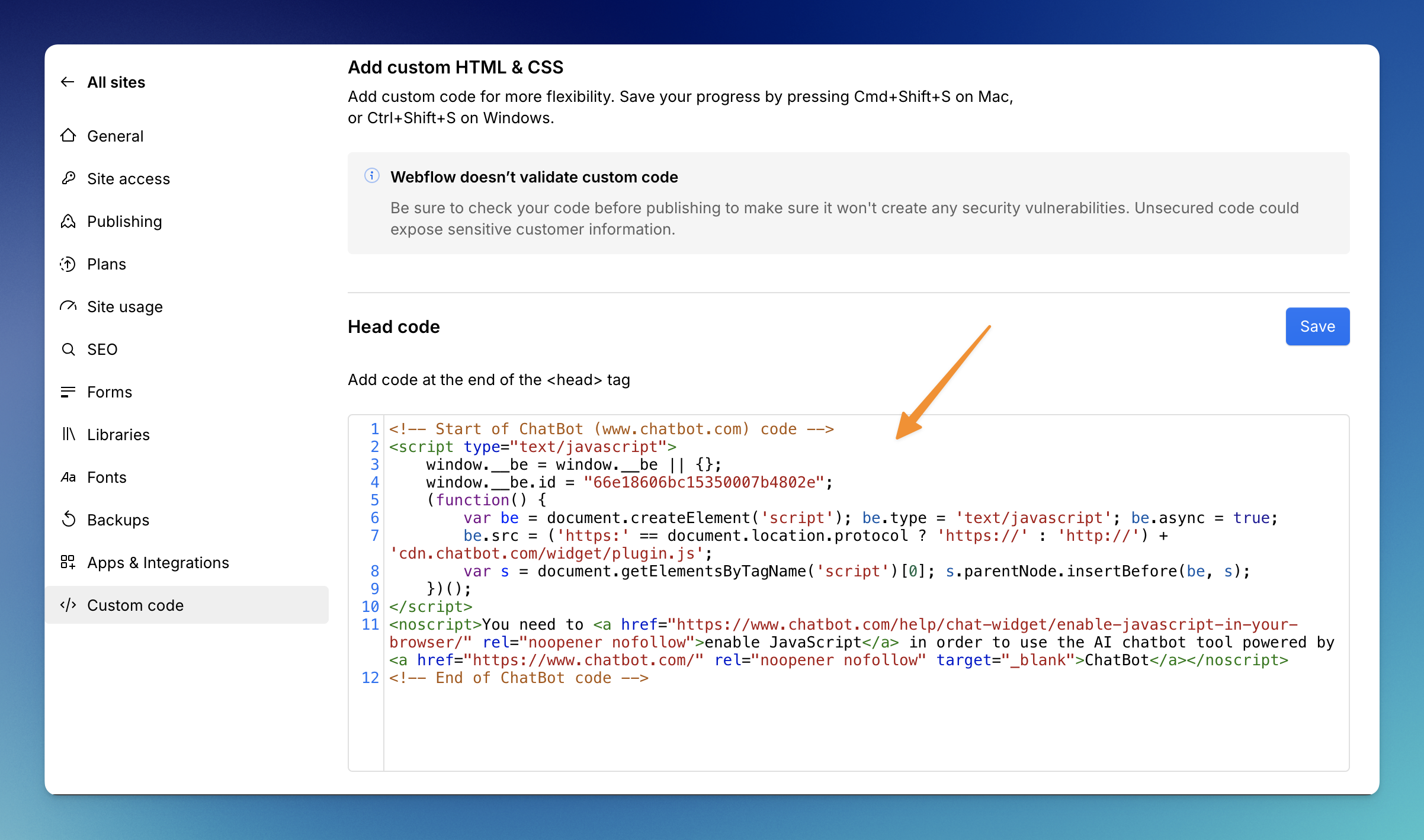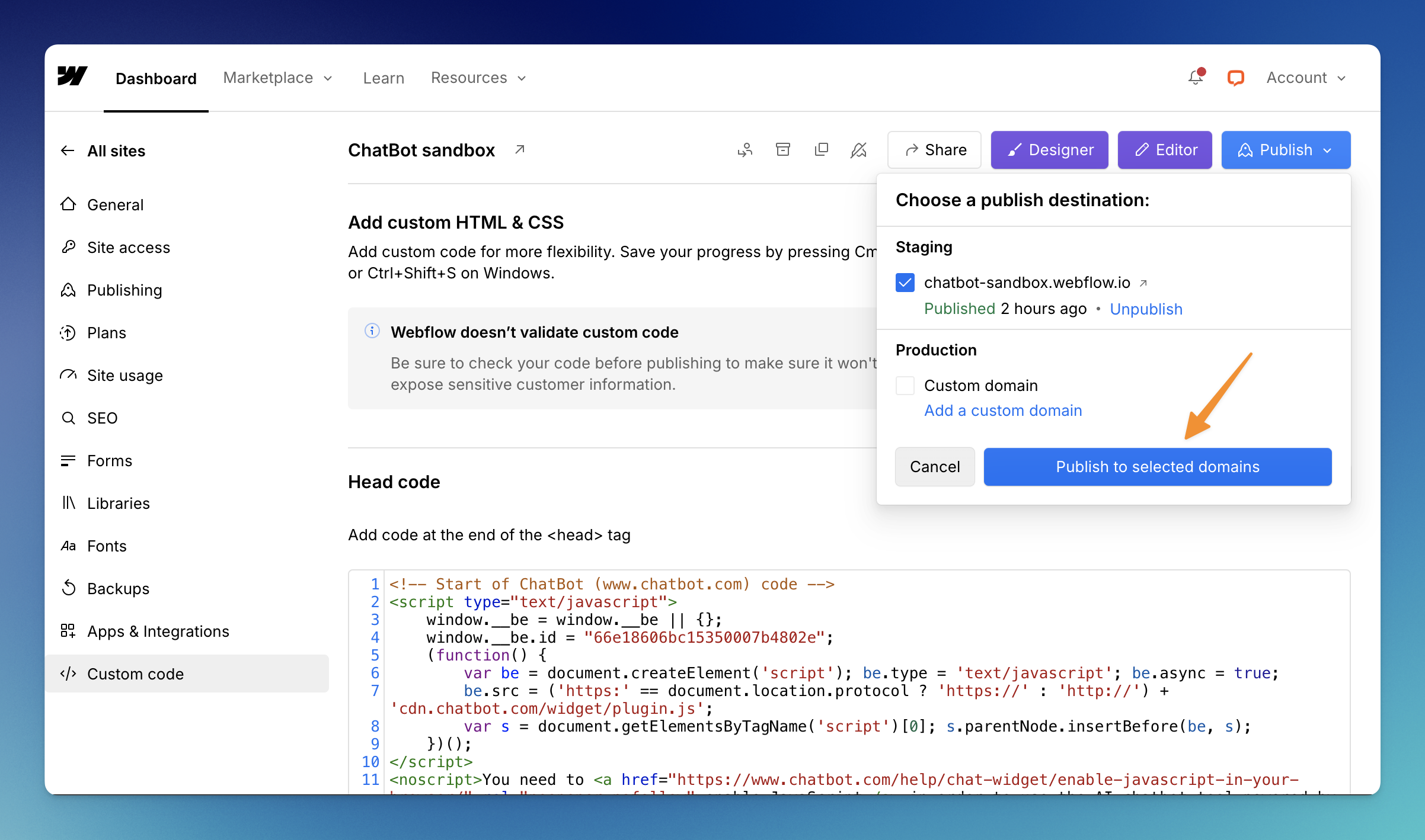 6. Paste ChatBot’s chat widget code in the Head Code section.  Click on Save Changes. Once your changes are saved, select Publish