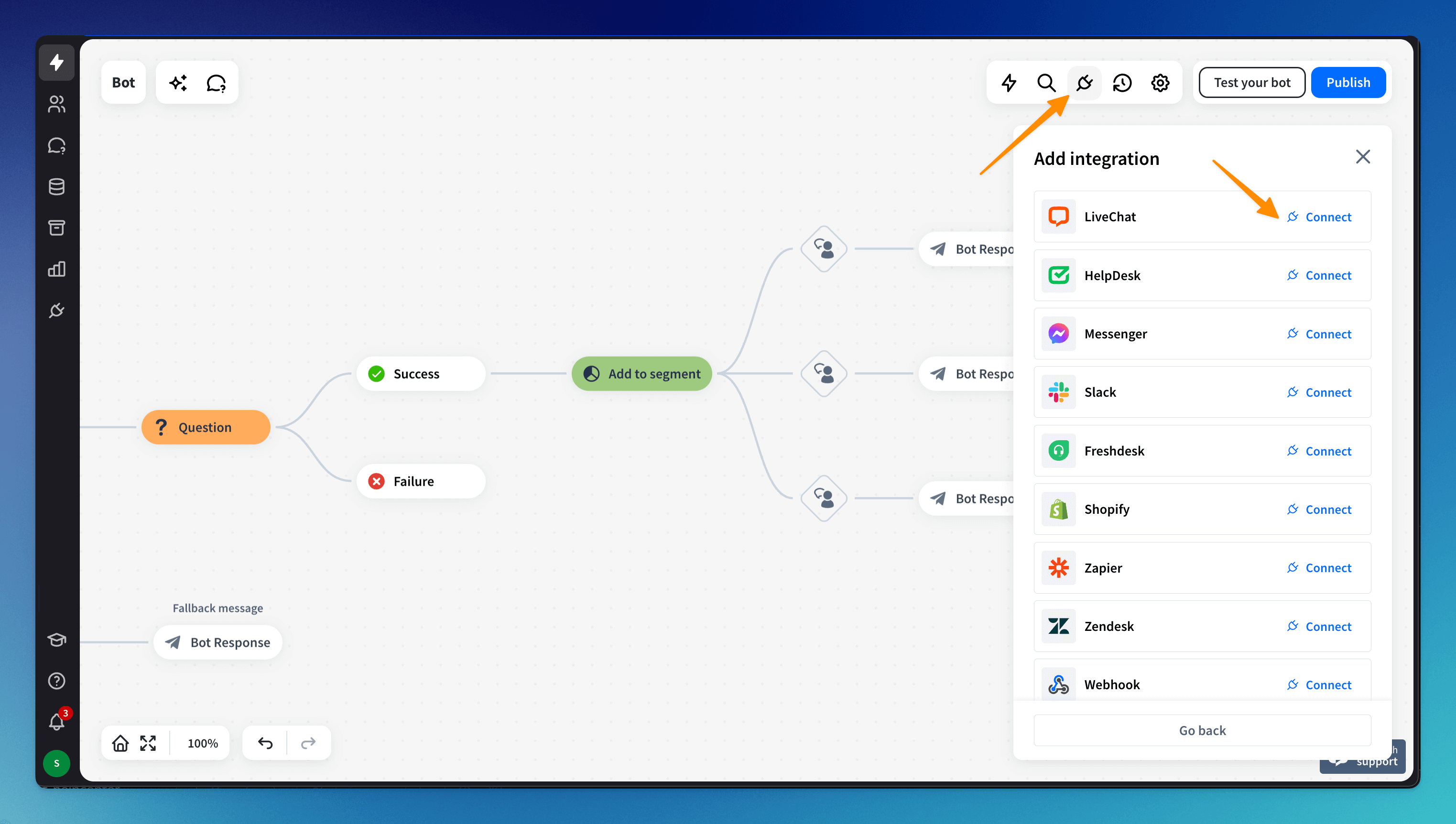 Go to the bot, choose the Integrations menu, select the integration from the list, and integrate it with only a few clicks. You can integrate the bot with multiple channels natively, directly from our product.