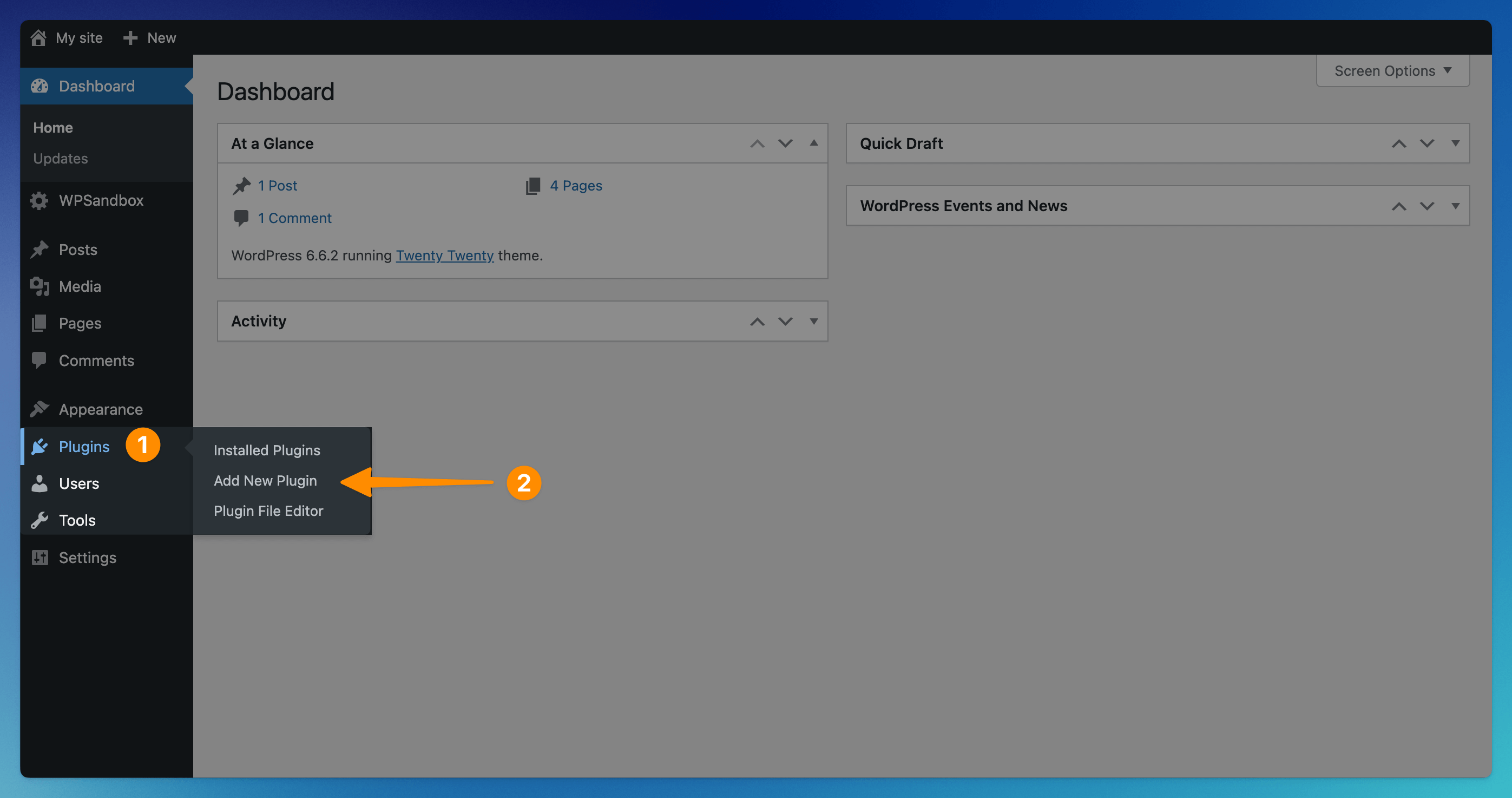 1. In your WordPress Dashboard, click on the Plugins (1) section and choose Add New Plugin (2) from the list.