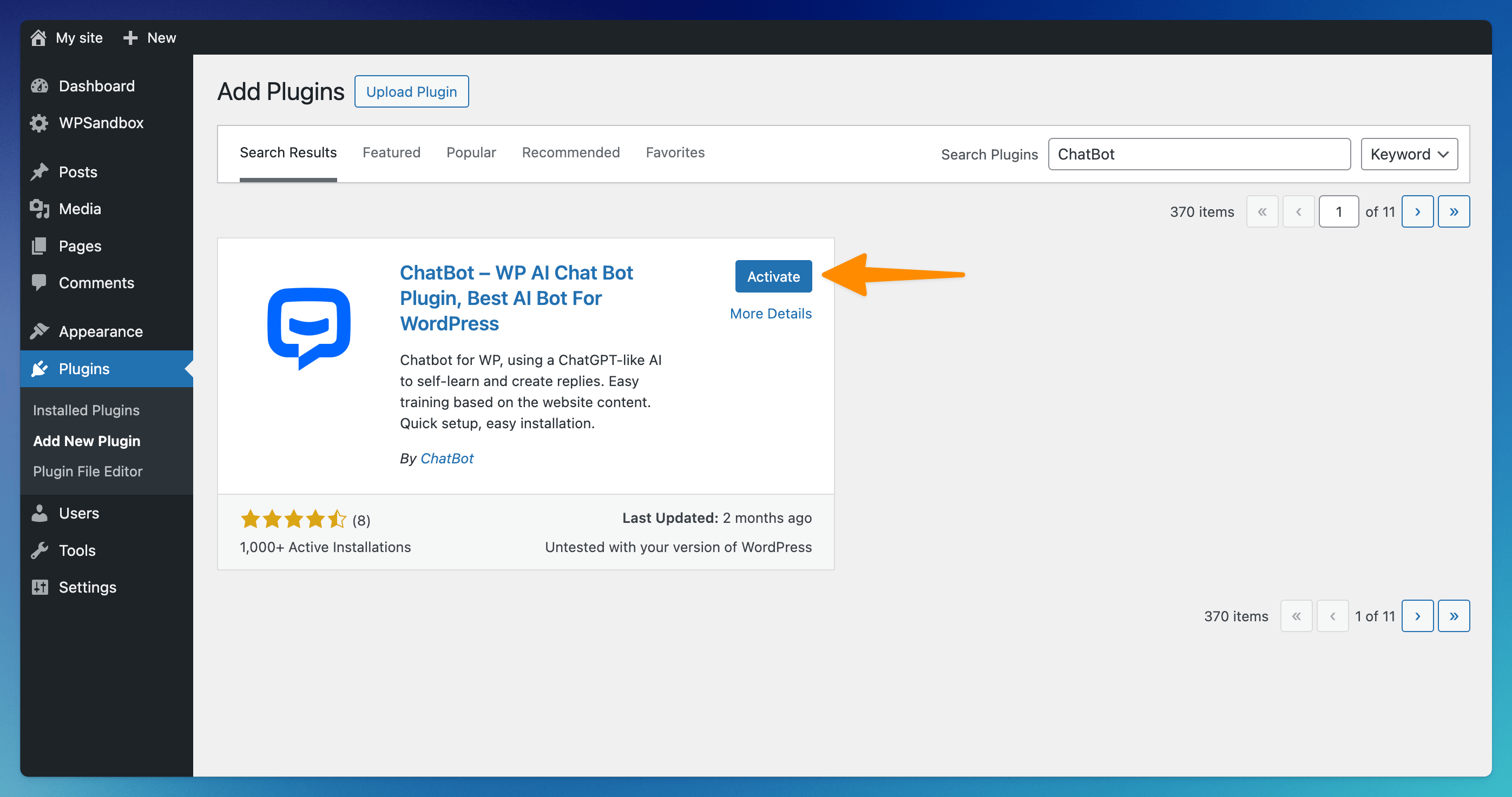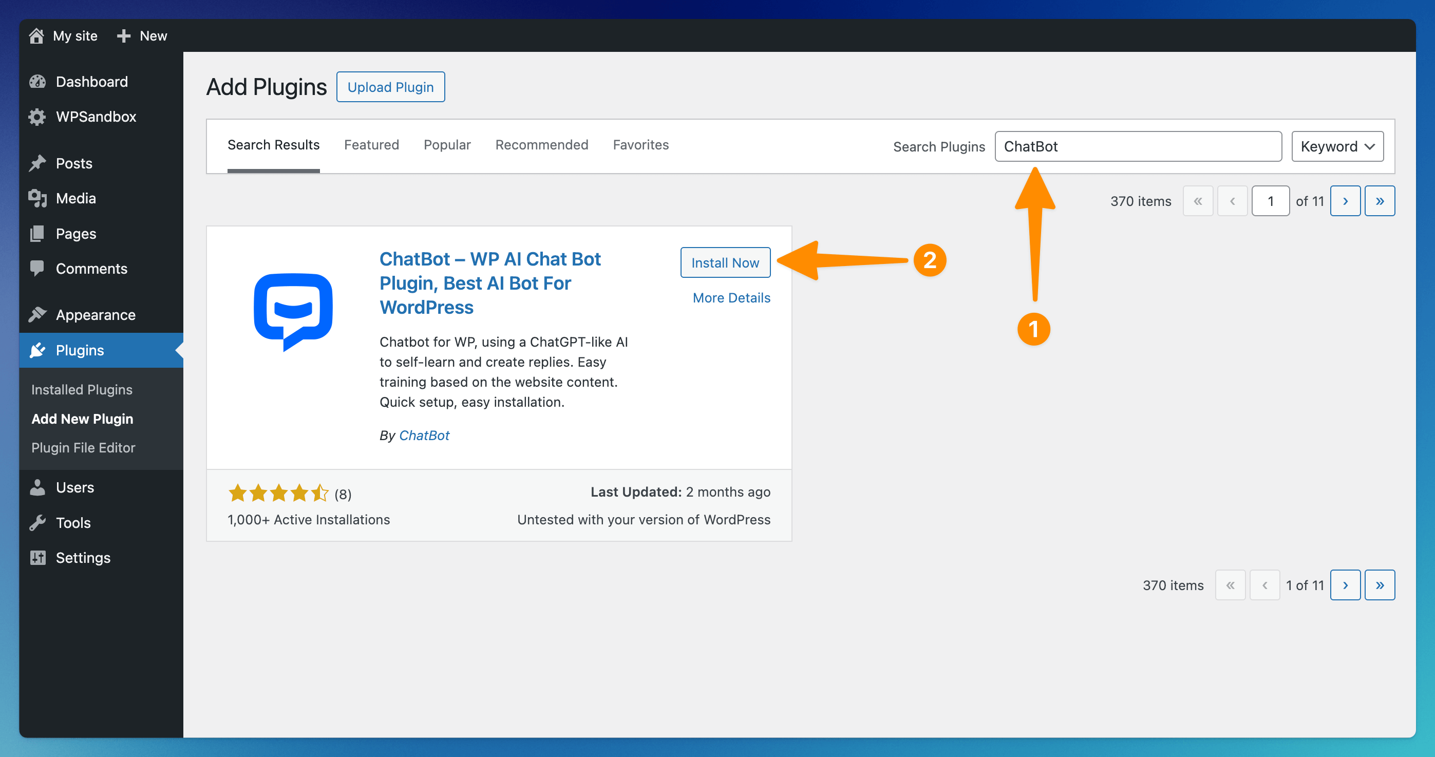 2. Type ChatBot in the search bar located on the right (1). Find ChatBot.com – WP chat bot plugin for WordPress on the list, and click on Install Now (2) to proceed.