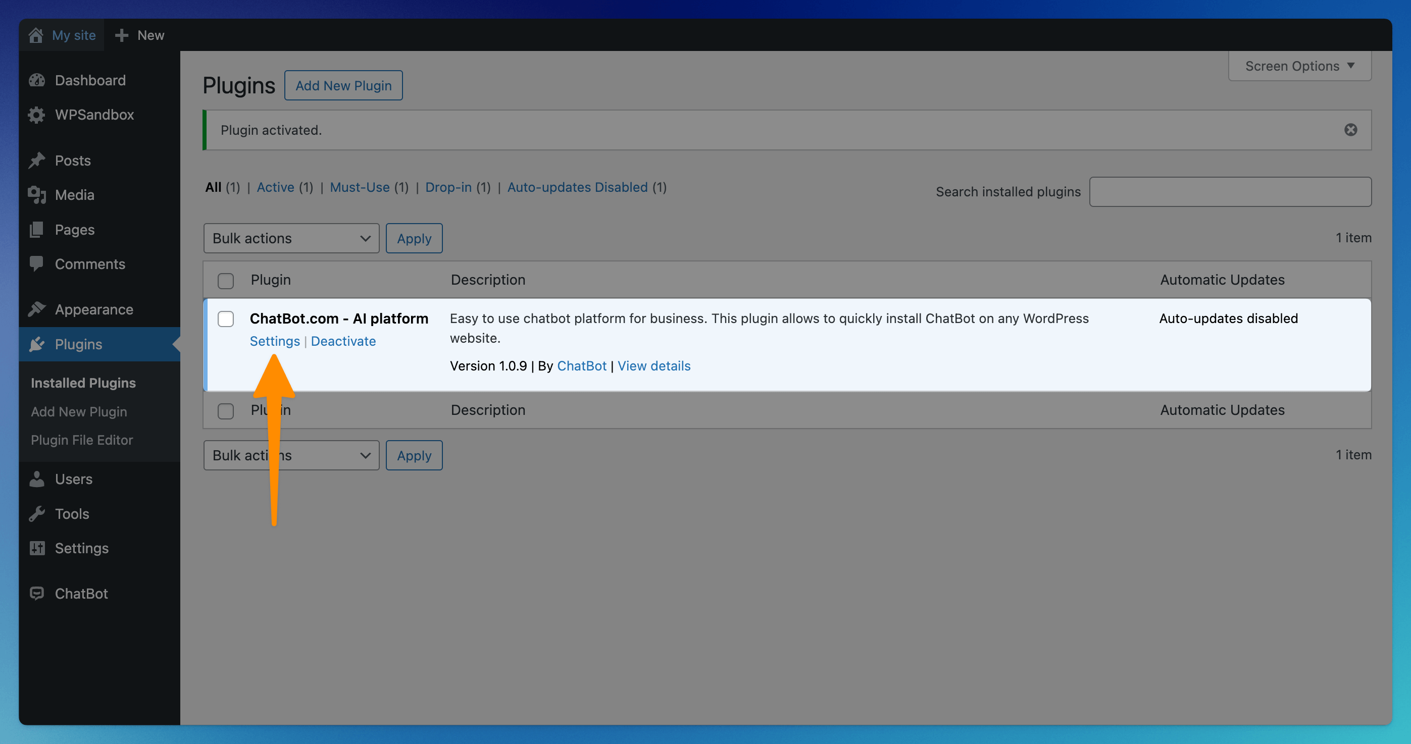 4. You will be redirected to the Plugins section in your WordPress. Click on the Settings button available under the ChatBot.com plugin.