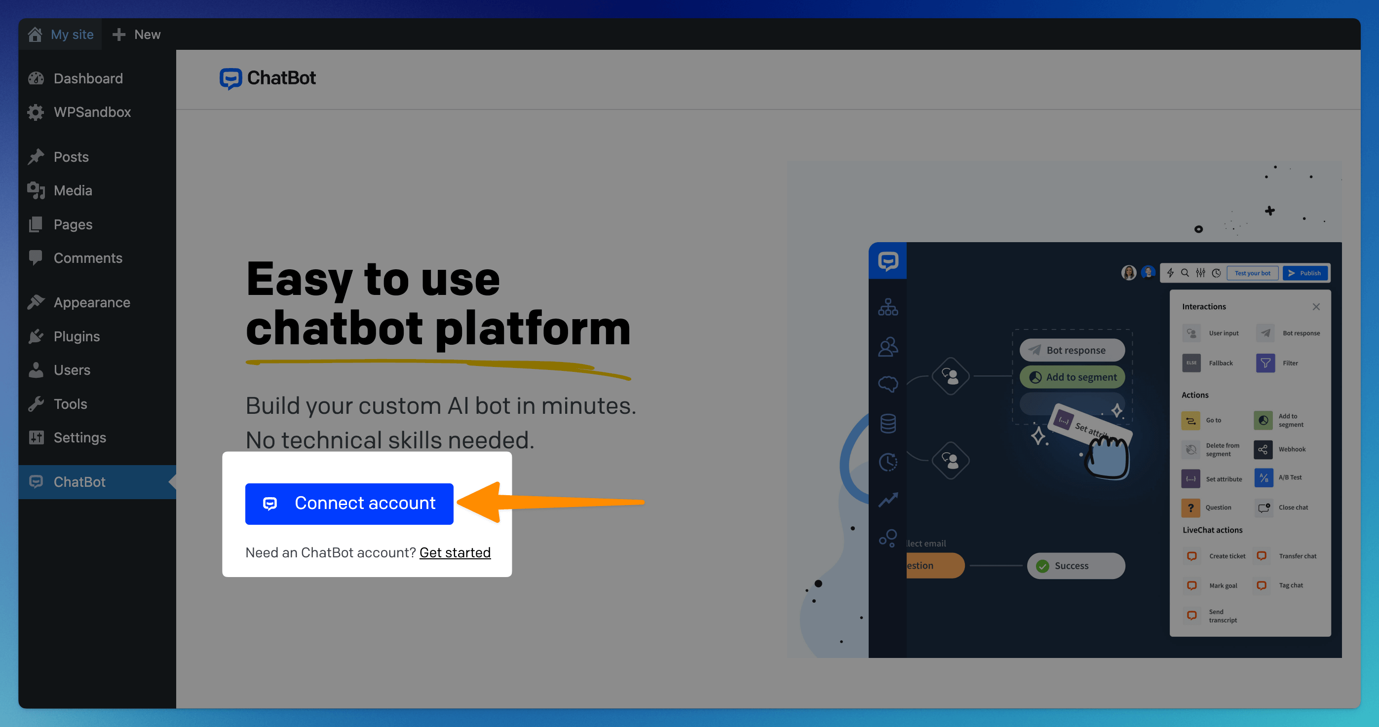 To create a chatbot for a WordPress site, you need to start a free ChatBot trial.