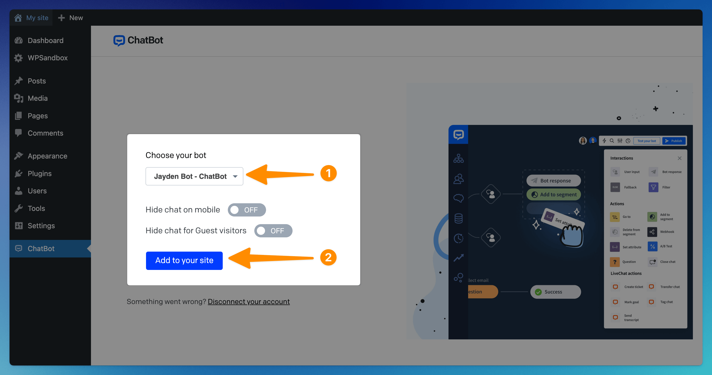 6. Almost ready! Select the bot you will use on your website (1). You can also decide whether your widget should be hidden on mobile or for guests. After that, click the Add to your Site button (2) to finish the installation.