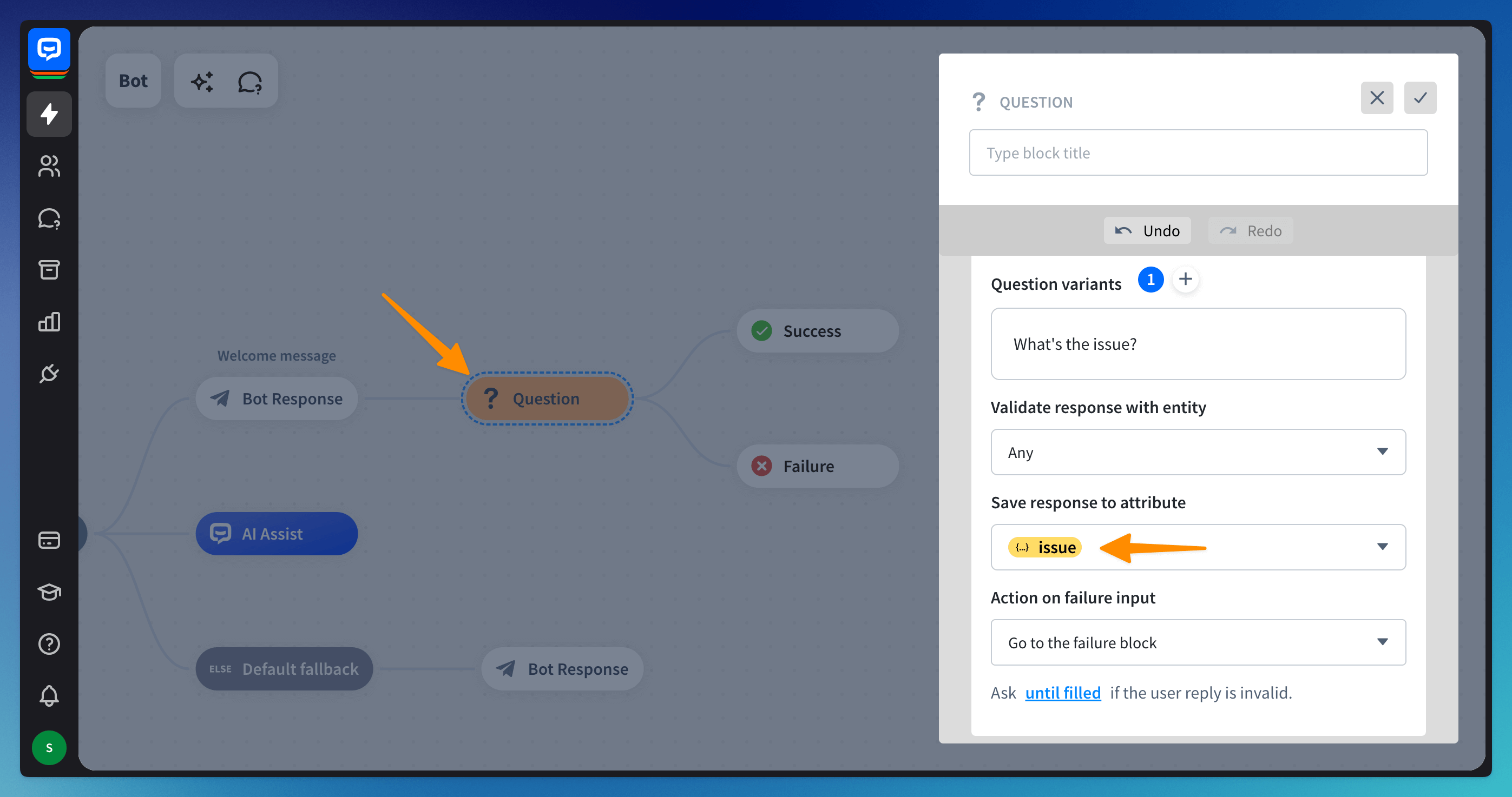 Remember to choose the correct validation type when setting up the Question action. Choose the Any validation type to save the whole message as an attribute.