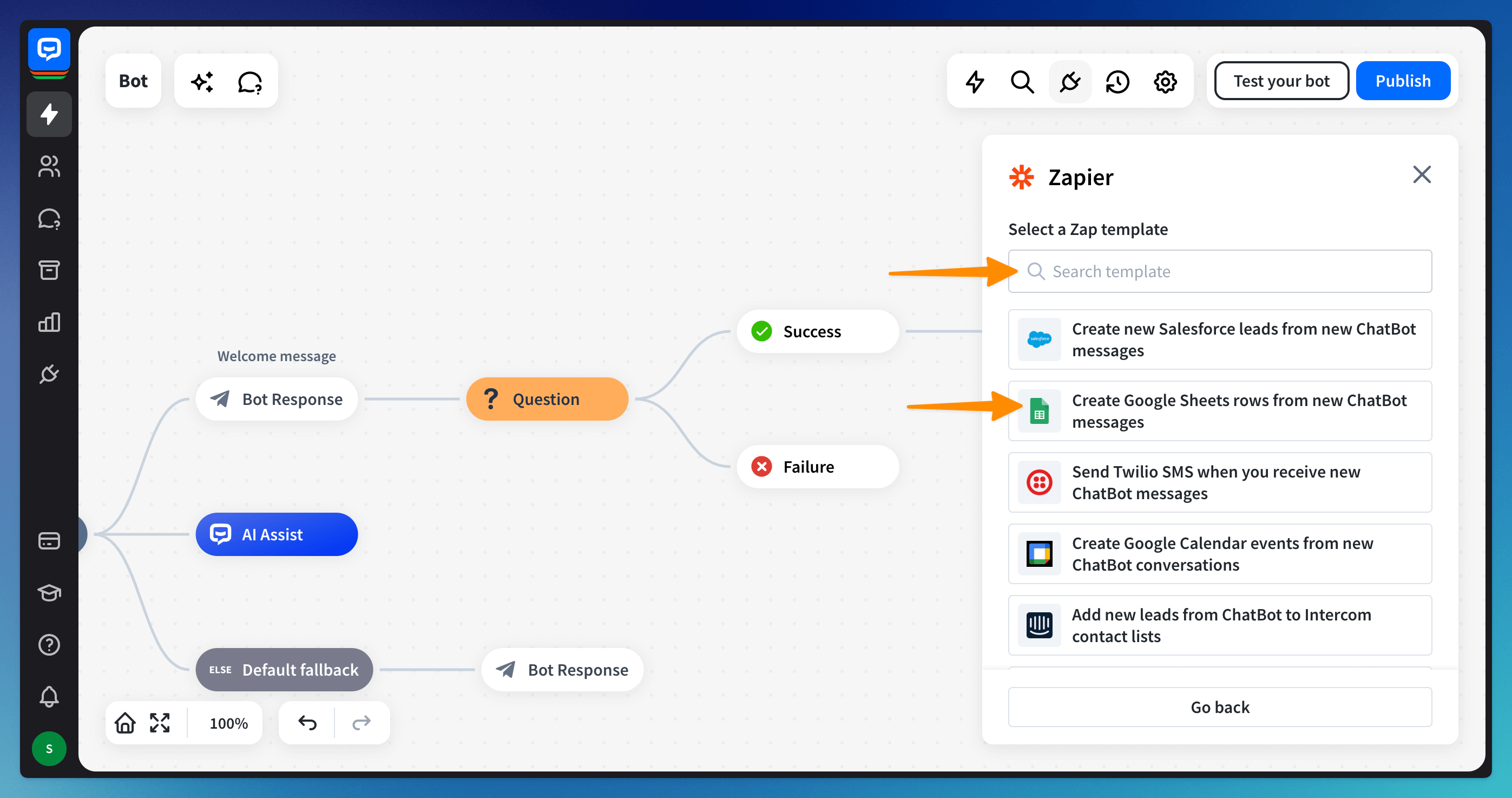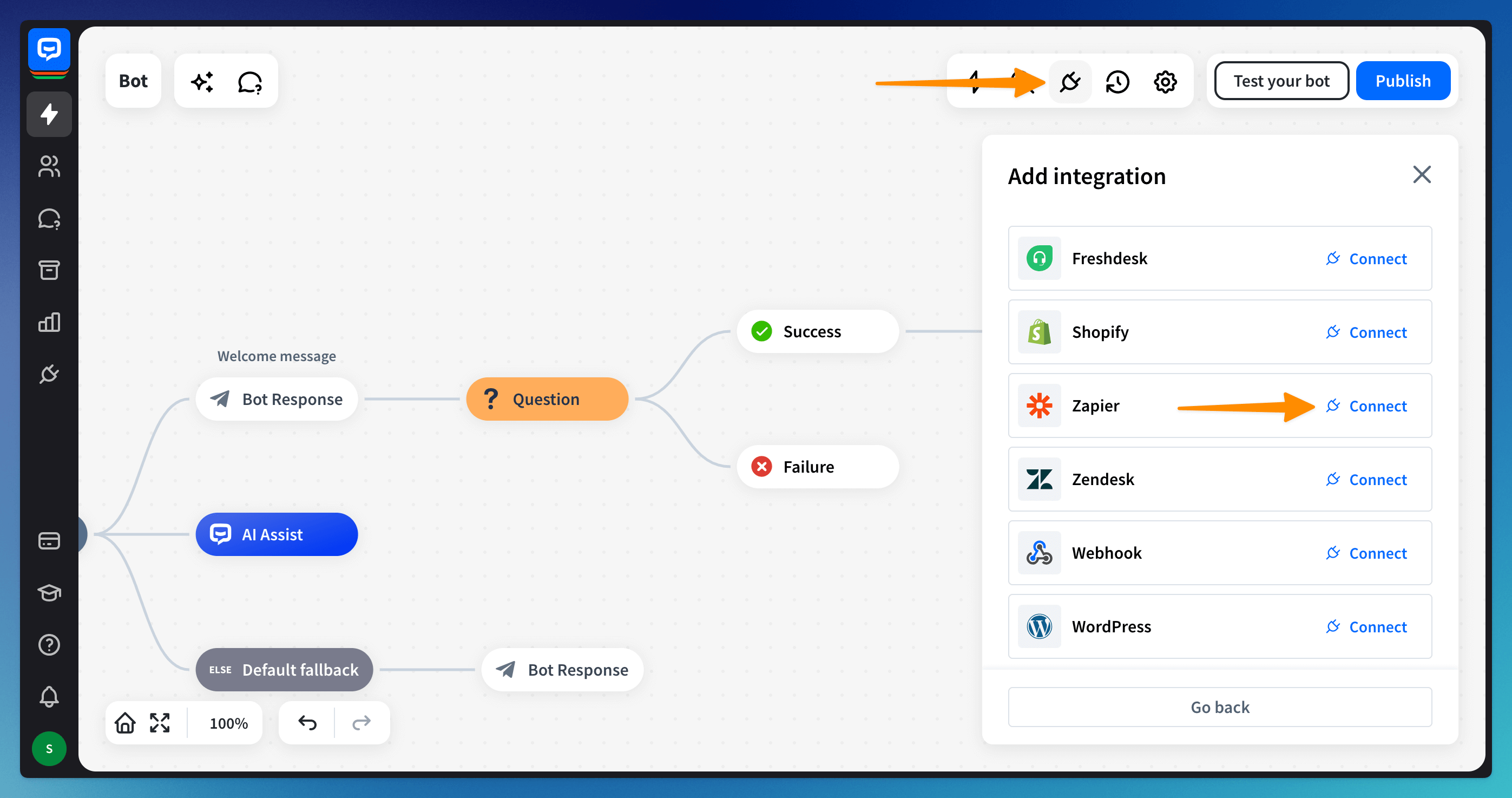 Go to the bot. Open the Integrations panel and choose Zapier from the list.