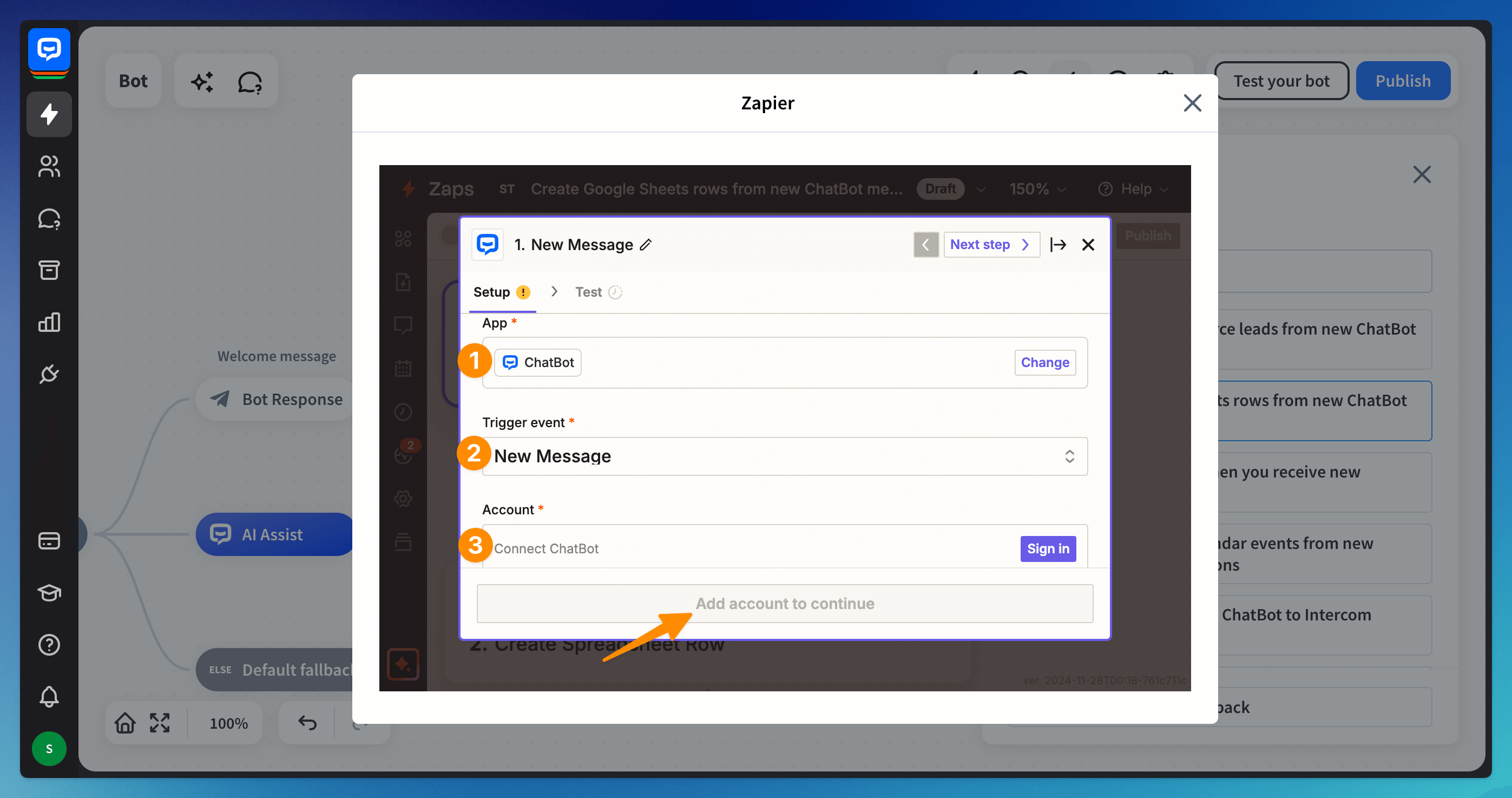 Click on the ChatBot module. Choose ChatBot in the App field (1), the New message in the Trigger event field (2). Then, sign in to the ChatBot account (3). Continue.