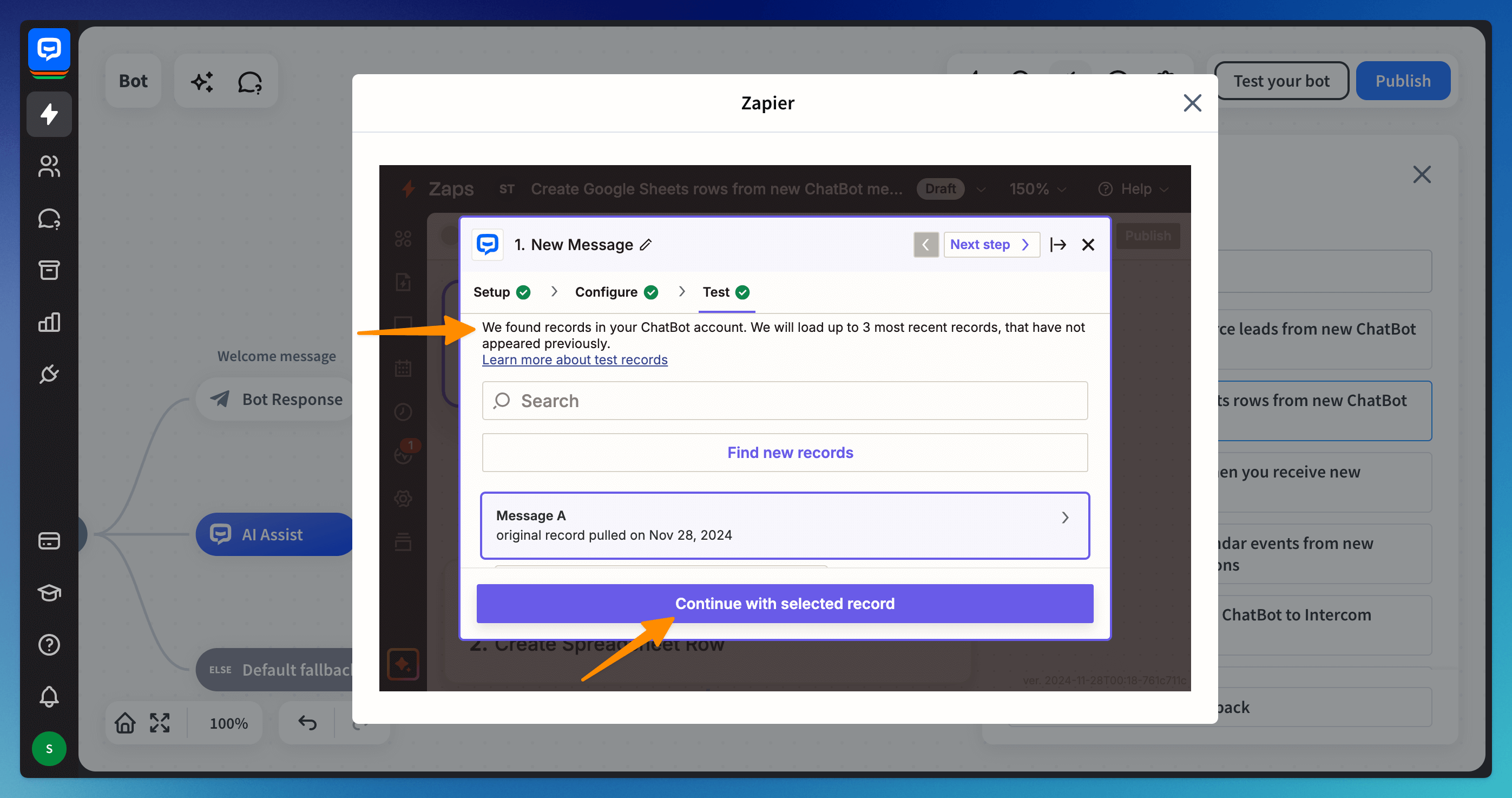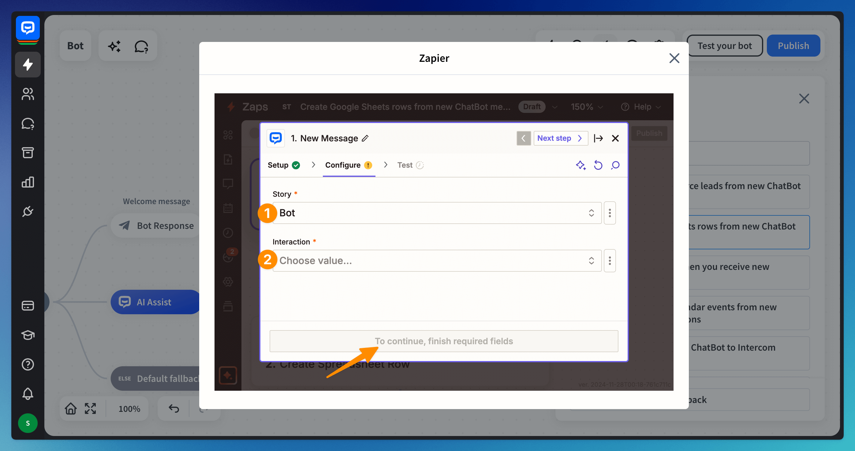 We have a native integration with Zapier. That means you can connect your bot with the app offered in the Zapier Marketplace directly in the bot view.