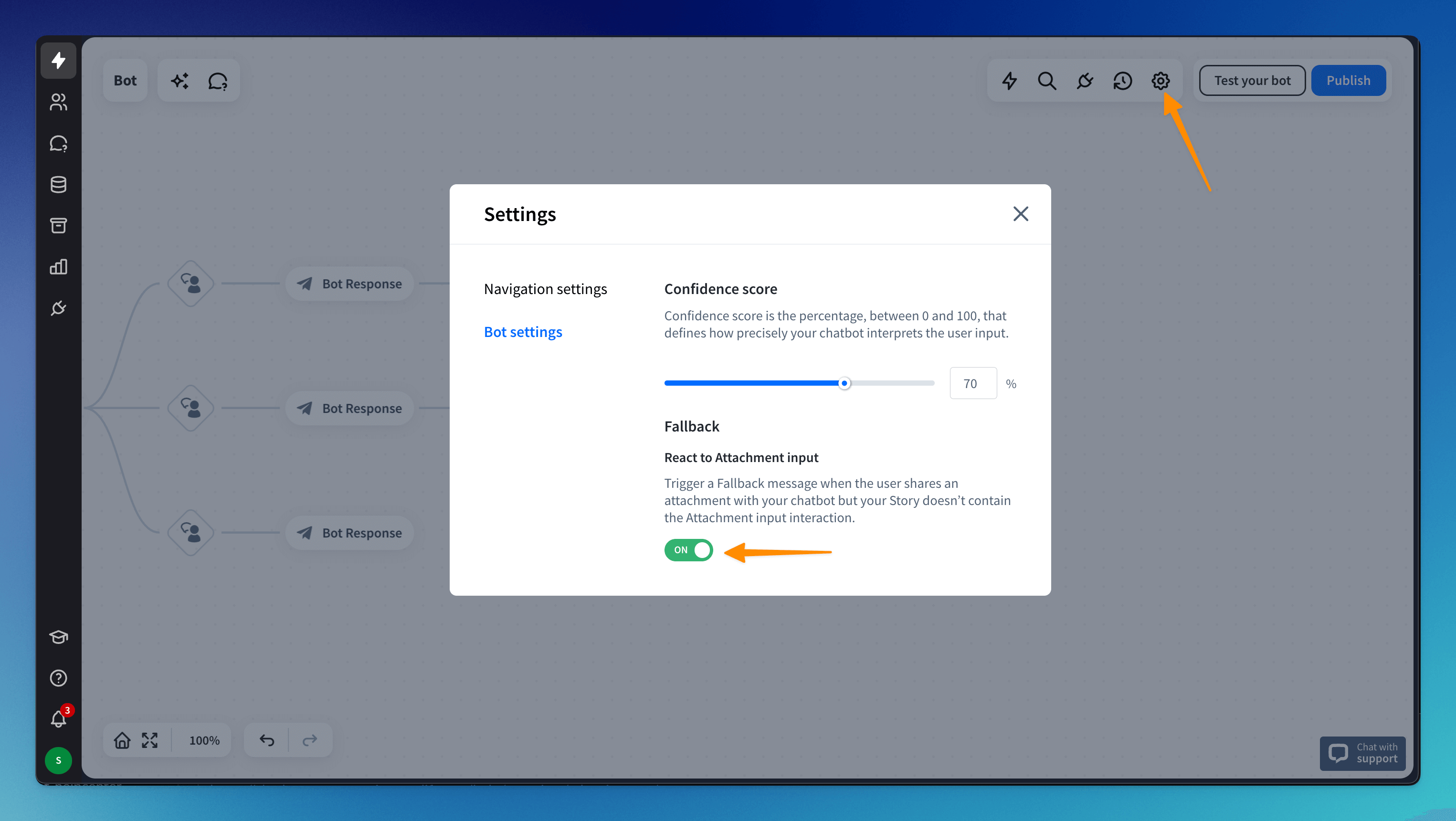 To display a Fallback message when the user tries to share a file but your bot flow doesn’t do that, go to Bot Settings and turn the React to attachment input option on.