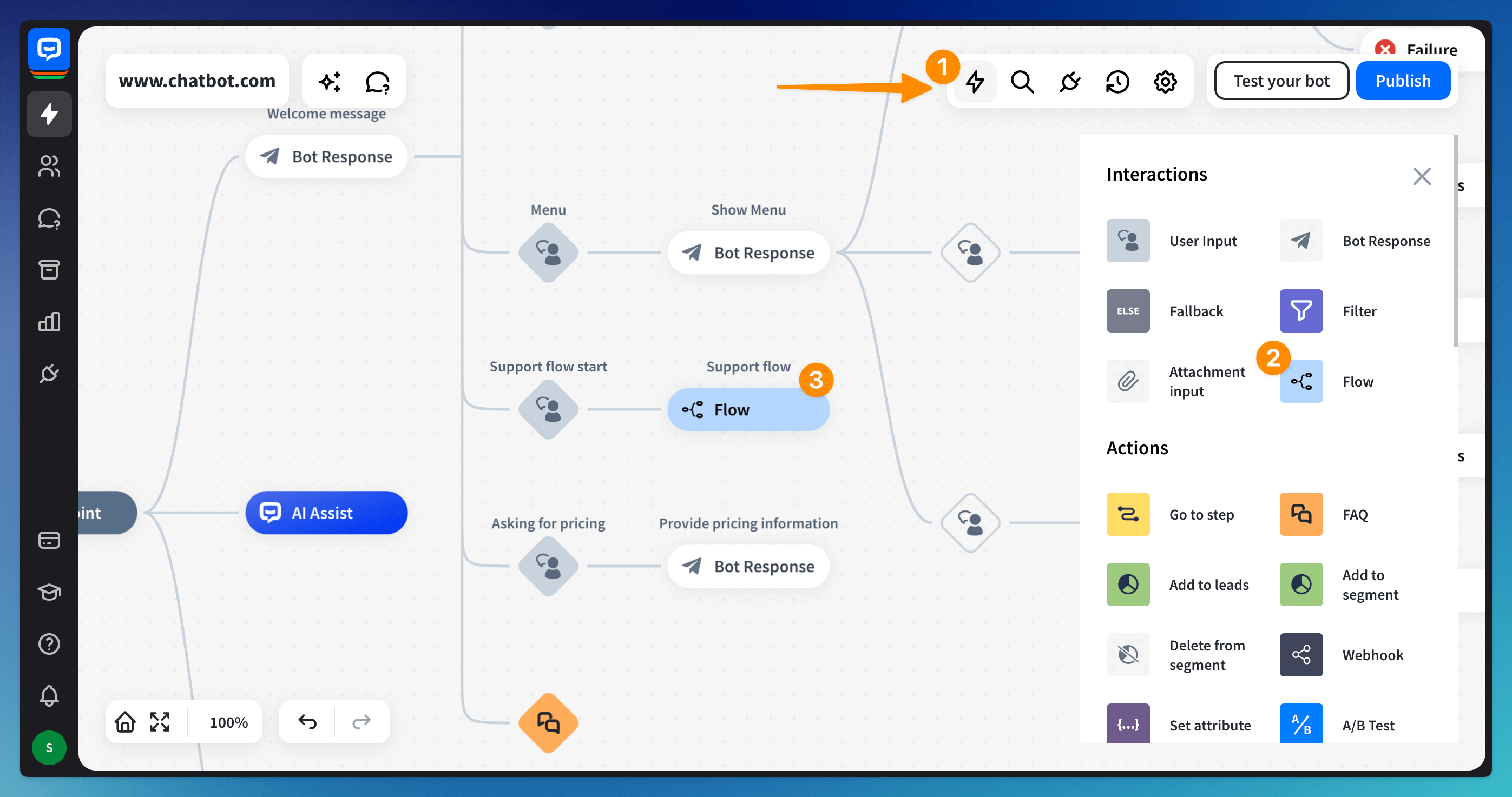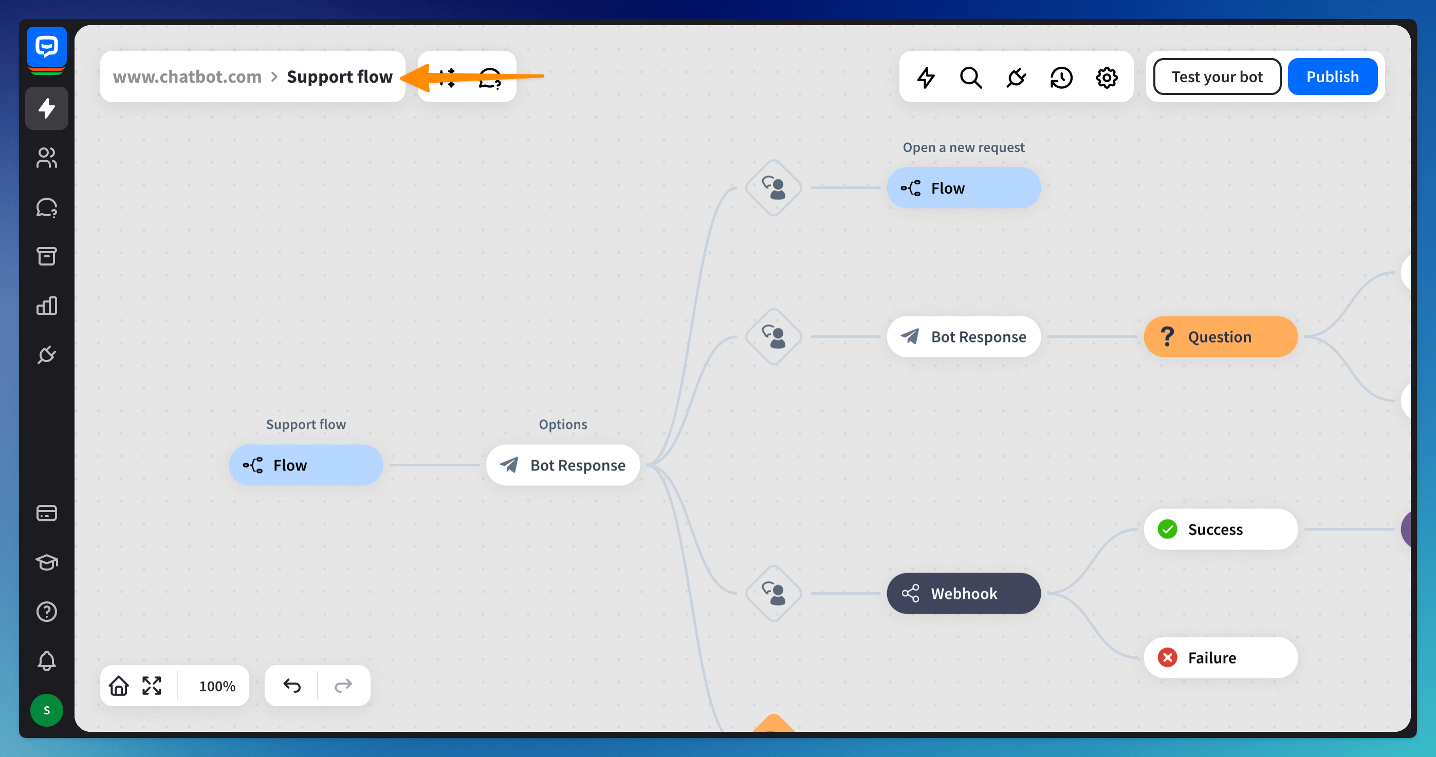 The Flow feature makes it easy to visually organize even the most complex chatbot structure. It lets you develop multiple paths inside your bot structure and represent them on the main level as individual blocks. This way, you can create complex yet compact structures and easily locate particular paths on the main conversation level.