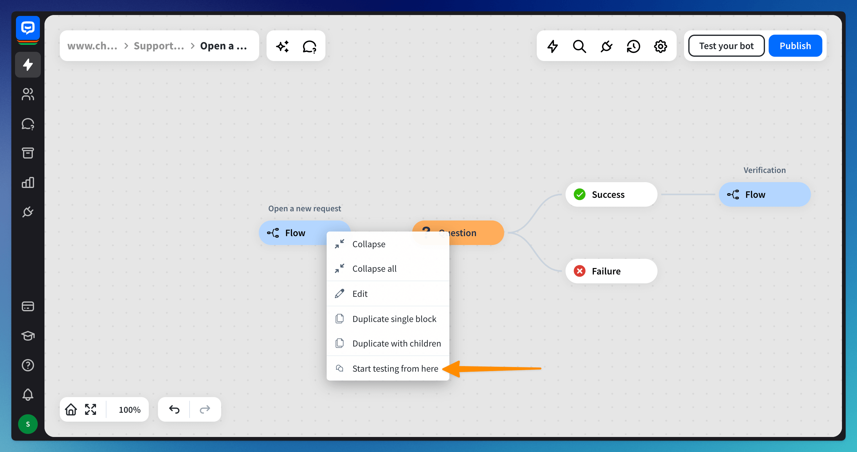 You can test the block contents without testing the whole bot flow. To test the flow inside the block, right-click the Flow block, and choose Start testing from here.