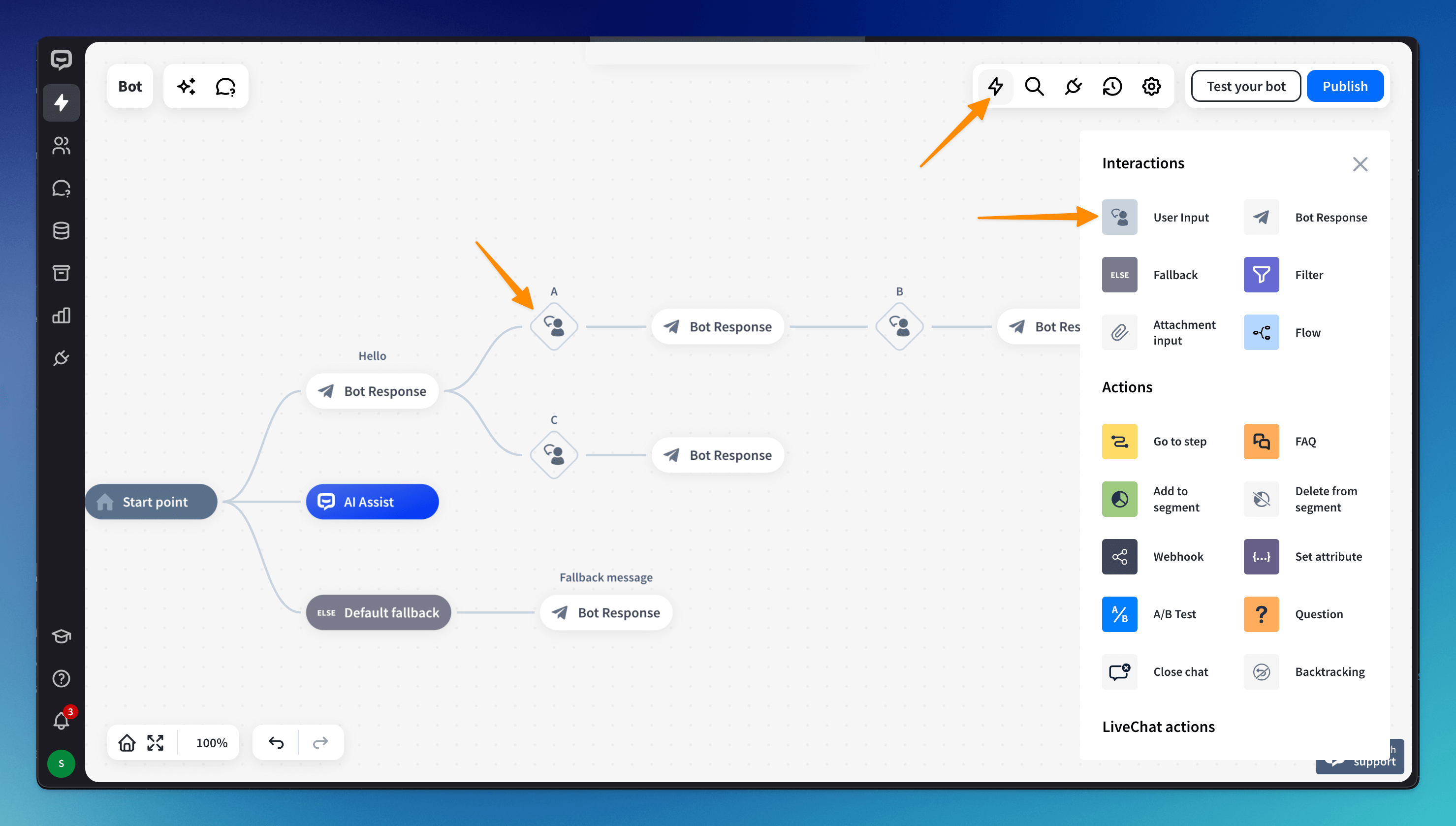 You can easily develop and manage your bot flow with Bot responses and User Inputs. To build the bot flow, drag and drop the User input block to the bot flow from the Interactions menu. Click on the block and add your Keywords and User says.