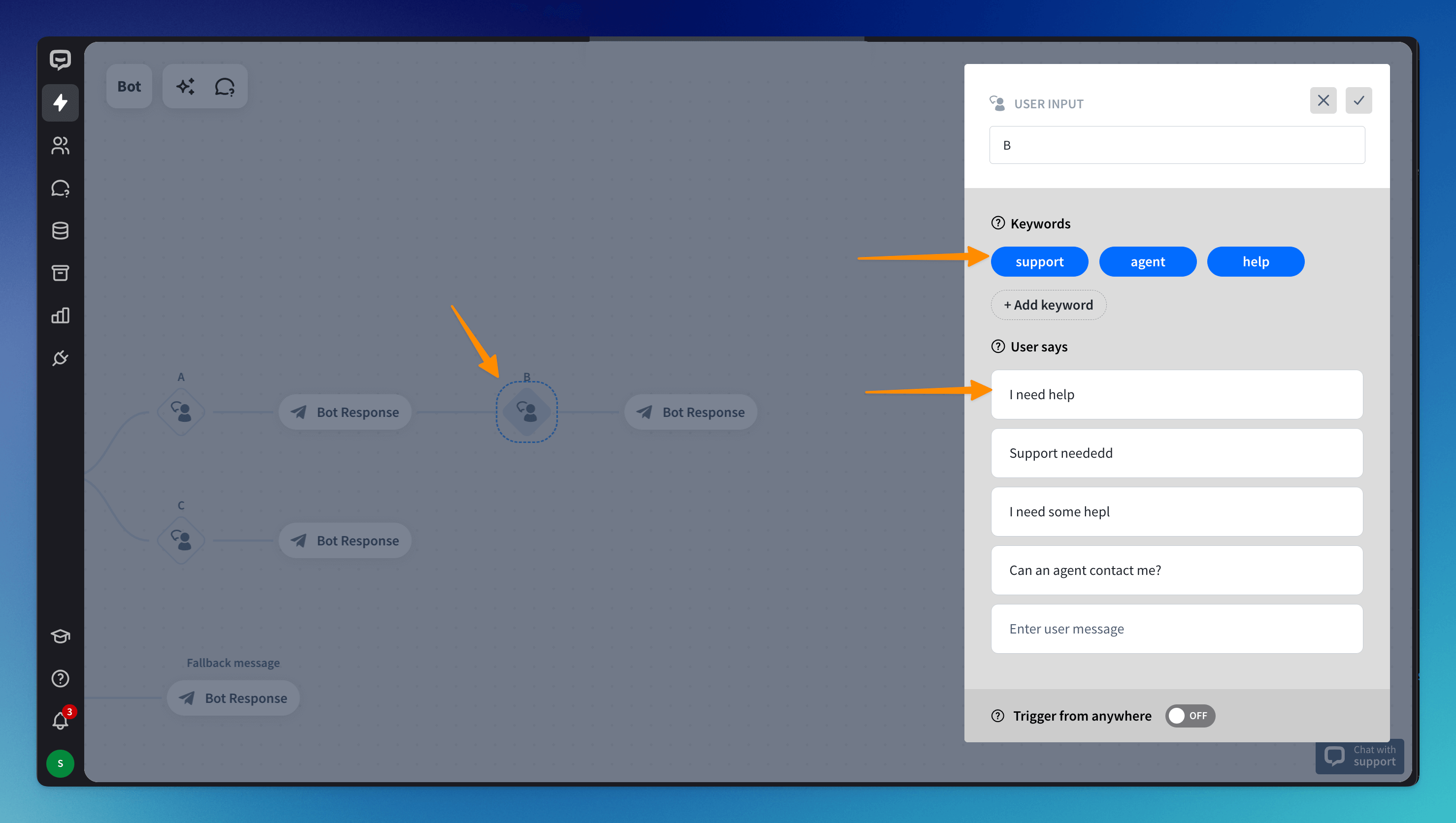 User input lets you define what types of user messages will trigger the bot’s response that follows.