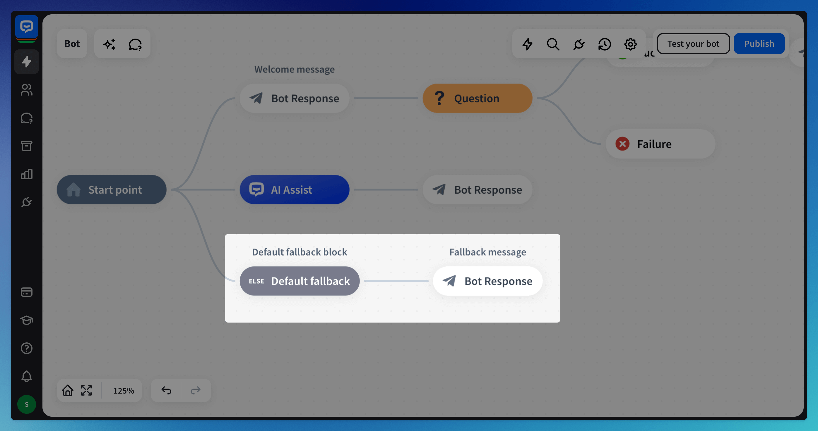 Default fallback lets you display a general bot’s message or trigger an action anytime your chatbot can’t match the user query with any chatbot response. By default, a Default fallback interaction is added to every chatbot. It consists of a Default Fallback block and a Bot response.