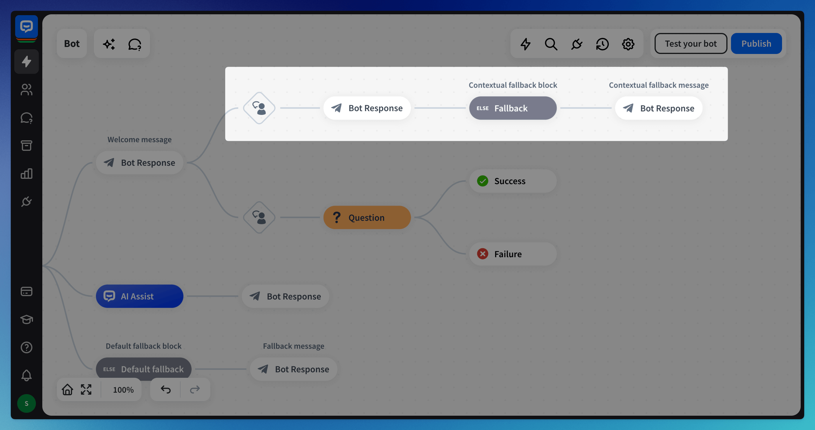 You can add contextual fallback for each chatbot flow path when the Default fallback interaction is insufficient. This block lets you display a dedicated bot’s message or action, delivering a more personalized chatbot experience.